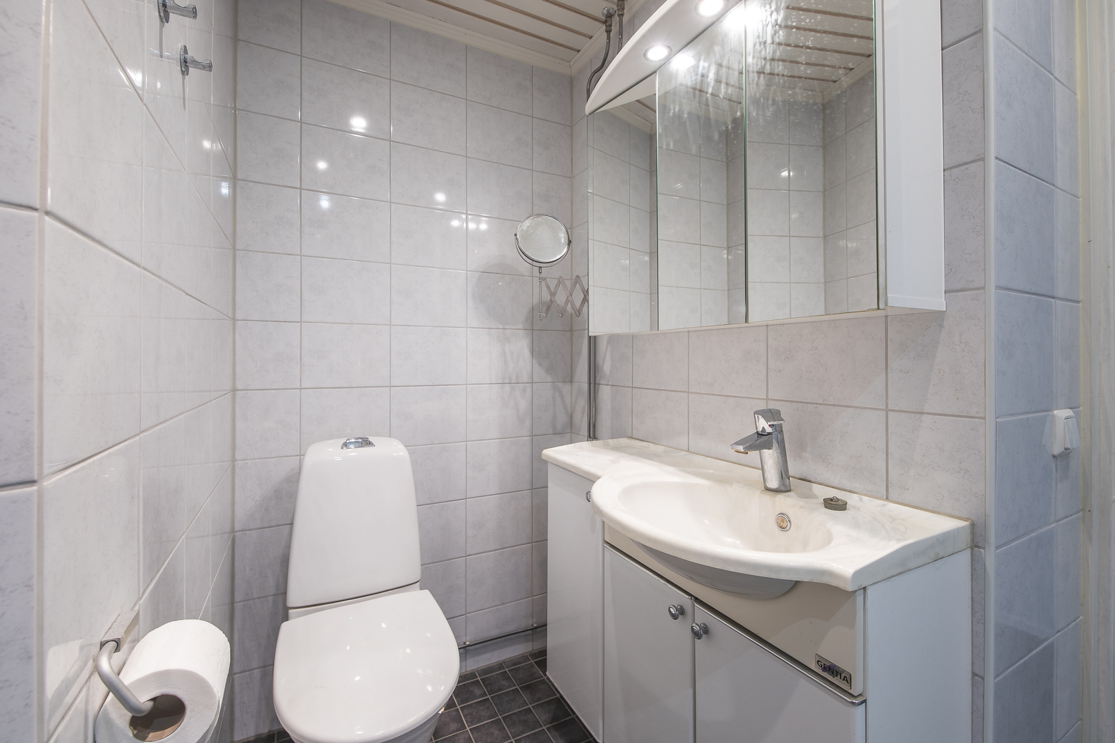 Kylpyhuoneen kuvaus WC-istuin, allaskaappi, peilikaappi, suihkuseinä, pesukoneliitäntä, suihku ja kiinteät valaisimet, seinät (kaakeli), lattiat (laatta)