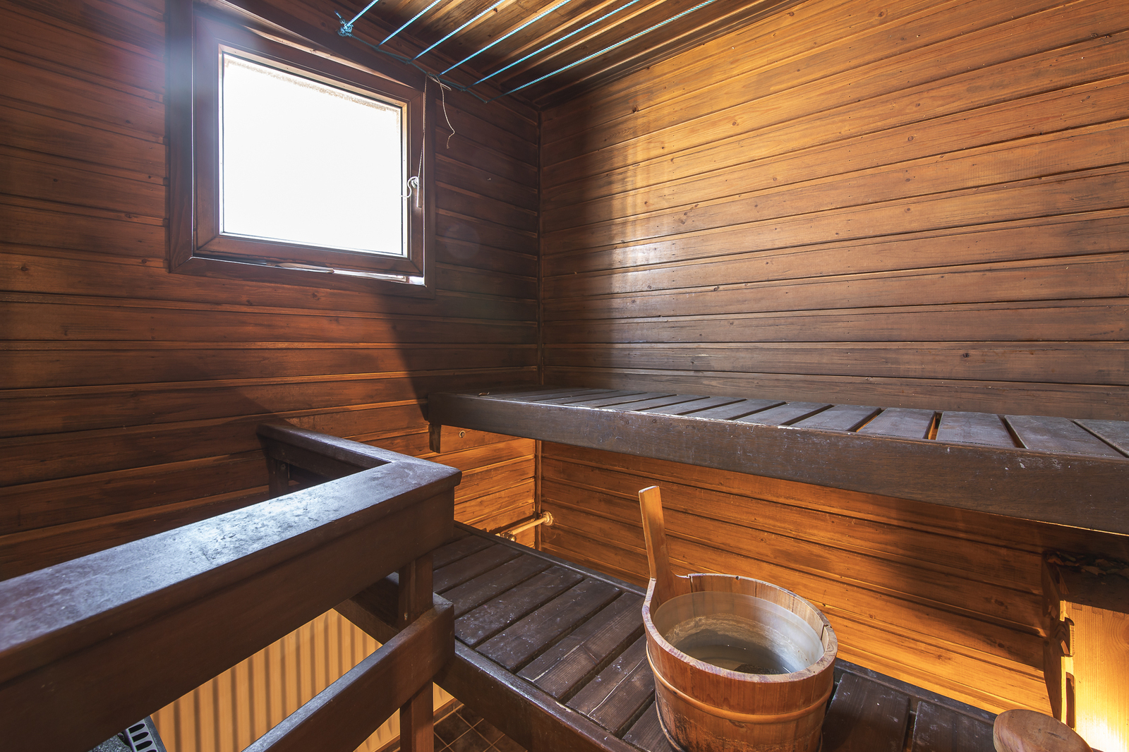 Saunan kuvaus Seinät (puu), lattiat (laatta), Sähkökiuas