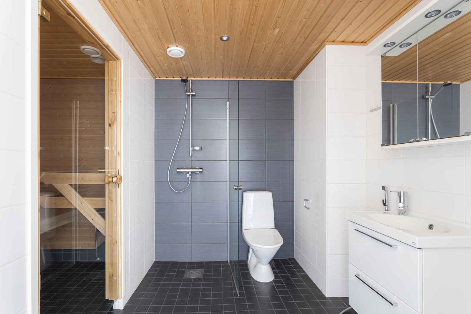 Suihku, wc-istuin, pesukoneliitäntä ja kiinteät valaisimet, seinät (kaakeli), lattiat (laatta) |