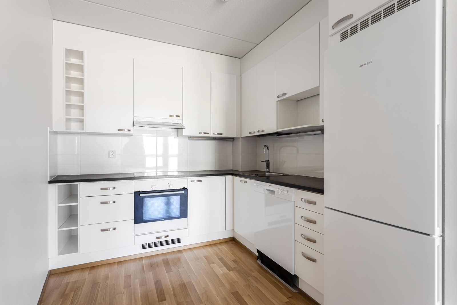 Liesi (Keraaminen liesi), työtasot (laminaatti), seinät (maali), lattiat (parketti), liesituuletin, jääkaappipakastin ja kiinteät valaisimet |