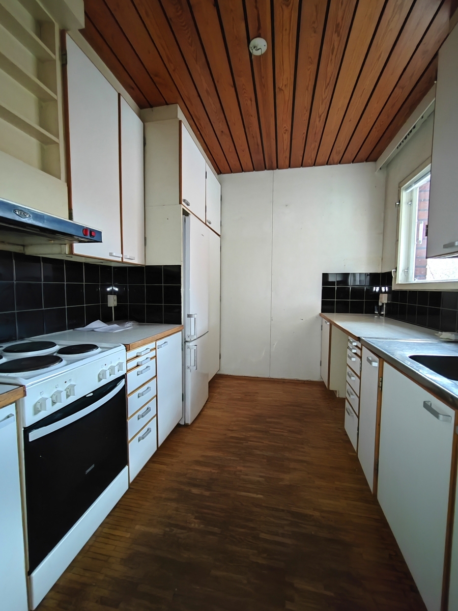 Liesi (sähköliesi), seinät (maali), lattiat (parketti), liesi, jääkaappipakastin ja liesituuletin |