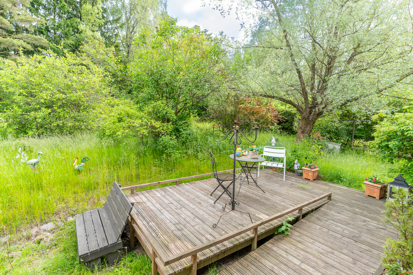 Kaunis puutarhatontti, jossa pieni metsä ja istutuksia ja omenapuita |