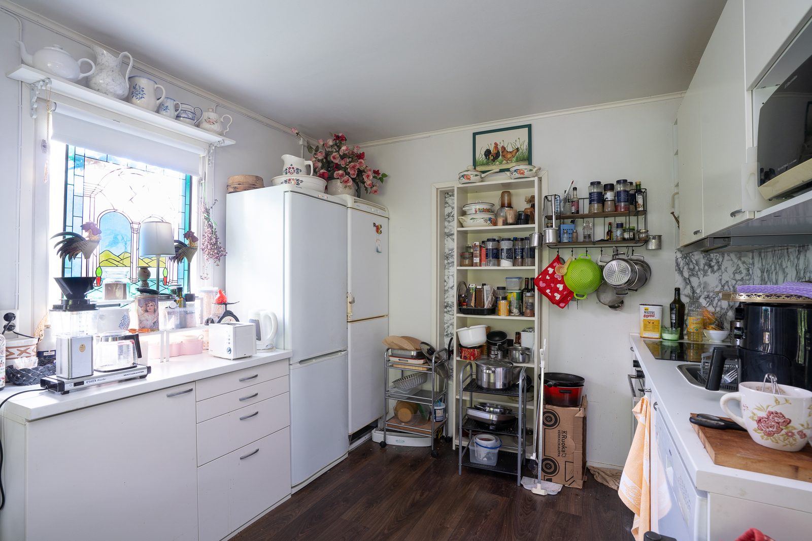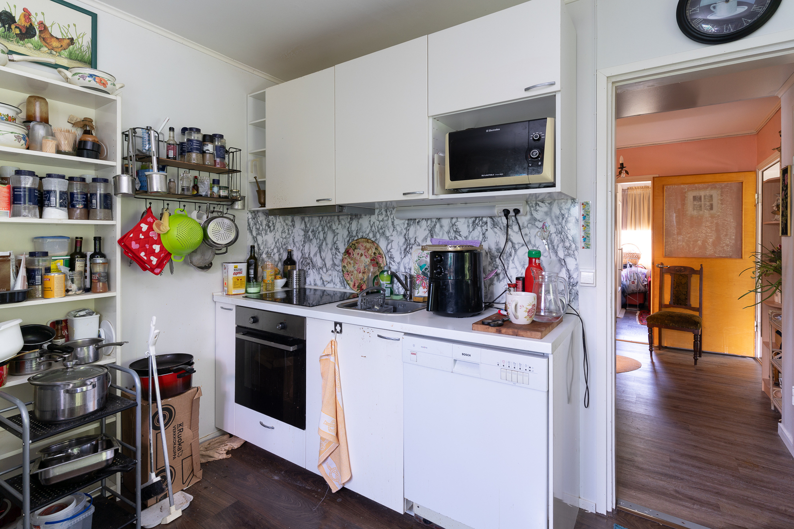 Liesi (Keraaminen liesi ja erillisuuni), työtasot (laminaatti), seinät (maali), lattiat (laminaatti), astianpesukone, jääkaappipakastin, erillisuuni ja liesituuletin |