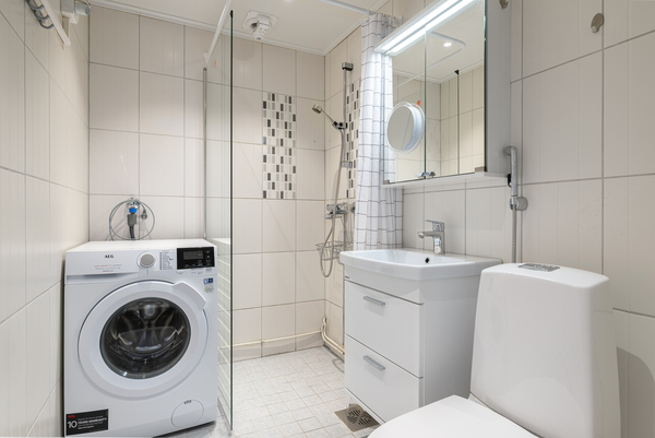 WC-istuin, suihku, pesukoneliitäntä, lattialämmitys, peilikaappi ja kiinteät valaisimet, seinät (kaakeli), lattiat (laatta) |
