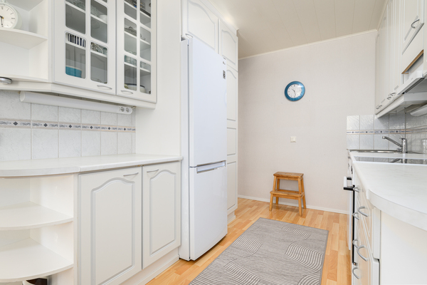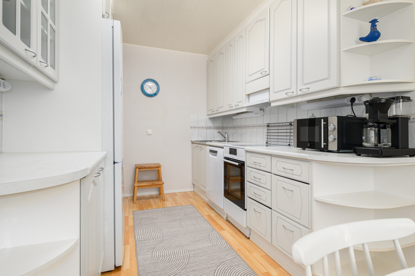 Liesi (Keraaminen liesi), seinät (maali ja osalaatoitus), lattiat (laminaatti), jääkaappipakastin, liesituuletin, astianpesukone ja kiinteät valaisimet |
