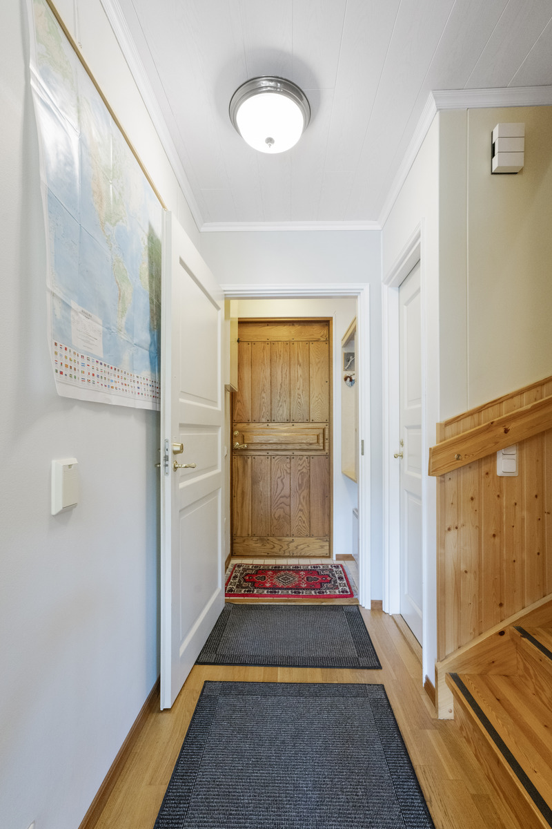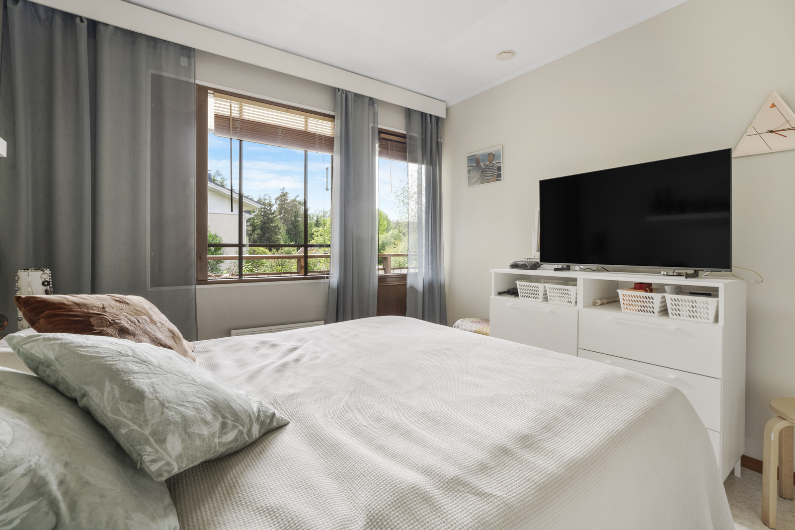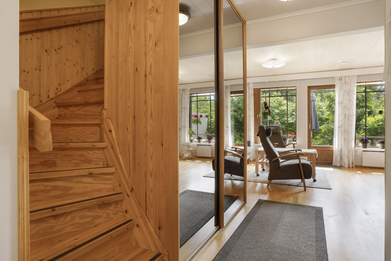 Alakerrassa sijaitsevat olohuone ja keittiö, jotka avautuvat suojaisalle pihalle, sekä erillinen wc. Yläkerrassa on kaksi tilavaa makuuhuonetta, joista toisessa vaatehuone ja toisessa parveke. Lisäksi yläkerrasta löytyvät kylpyhuone ja oma sauna.