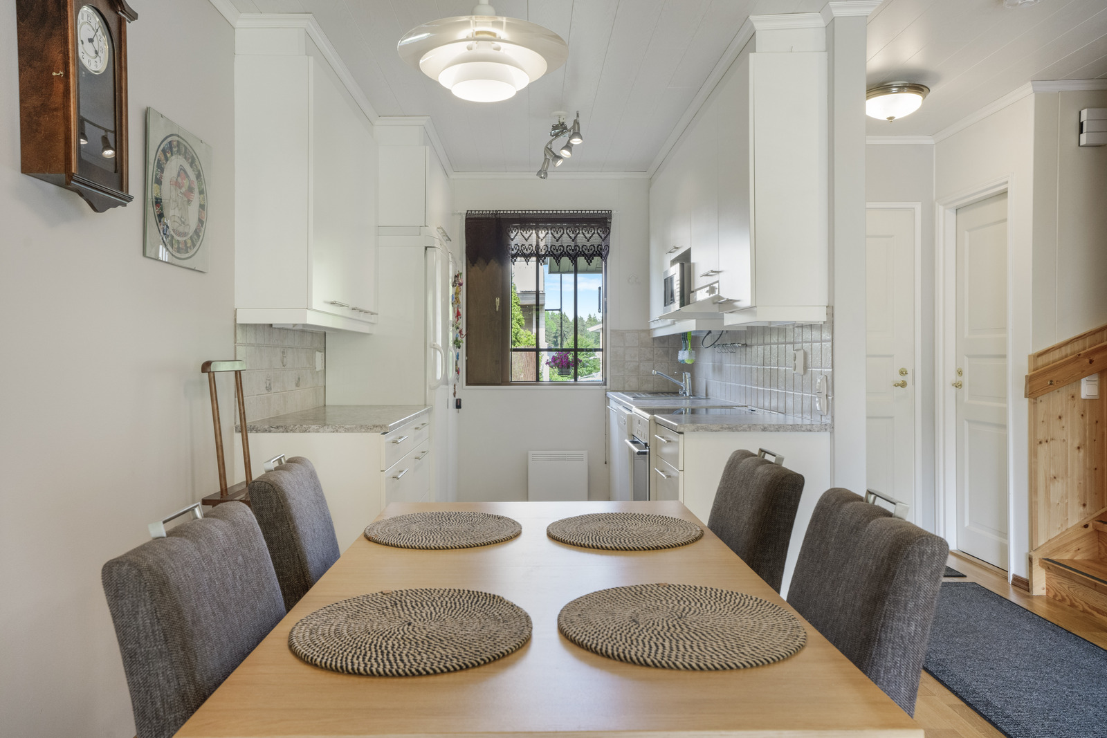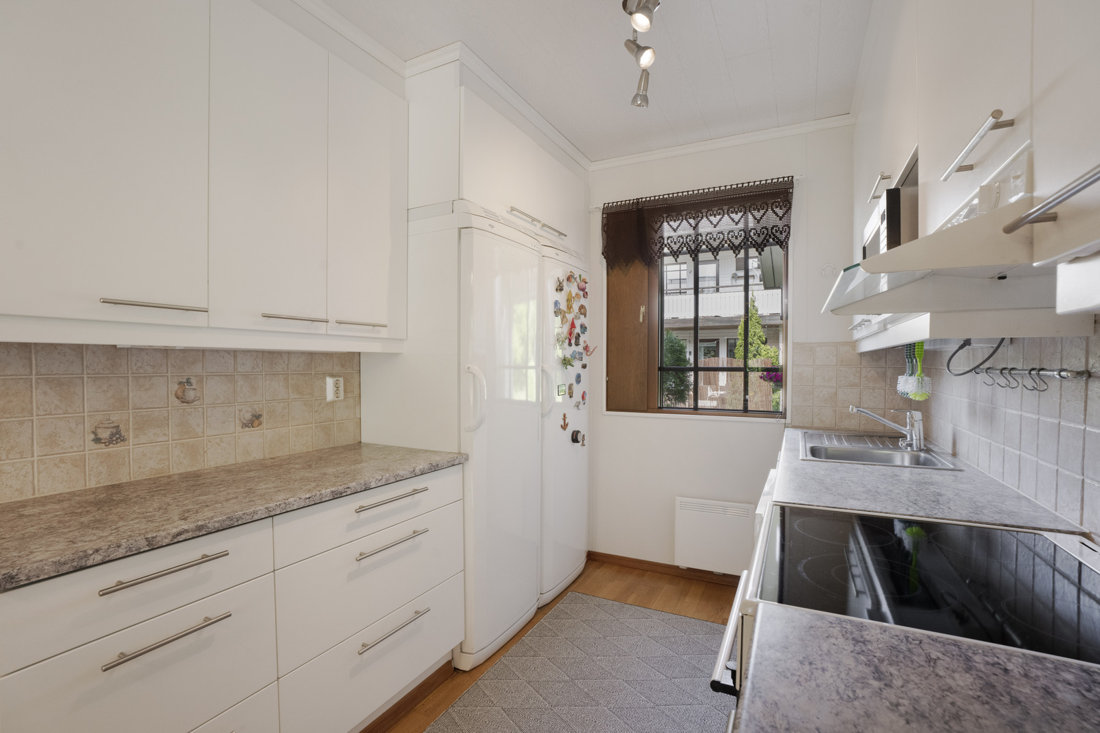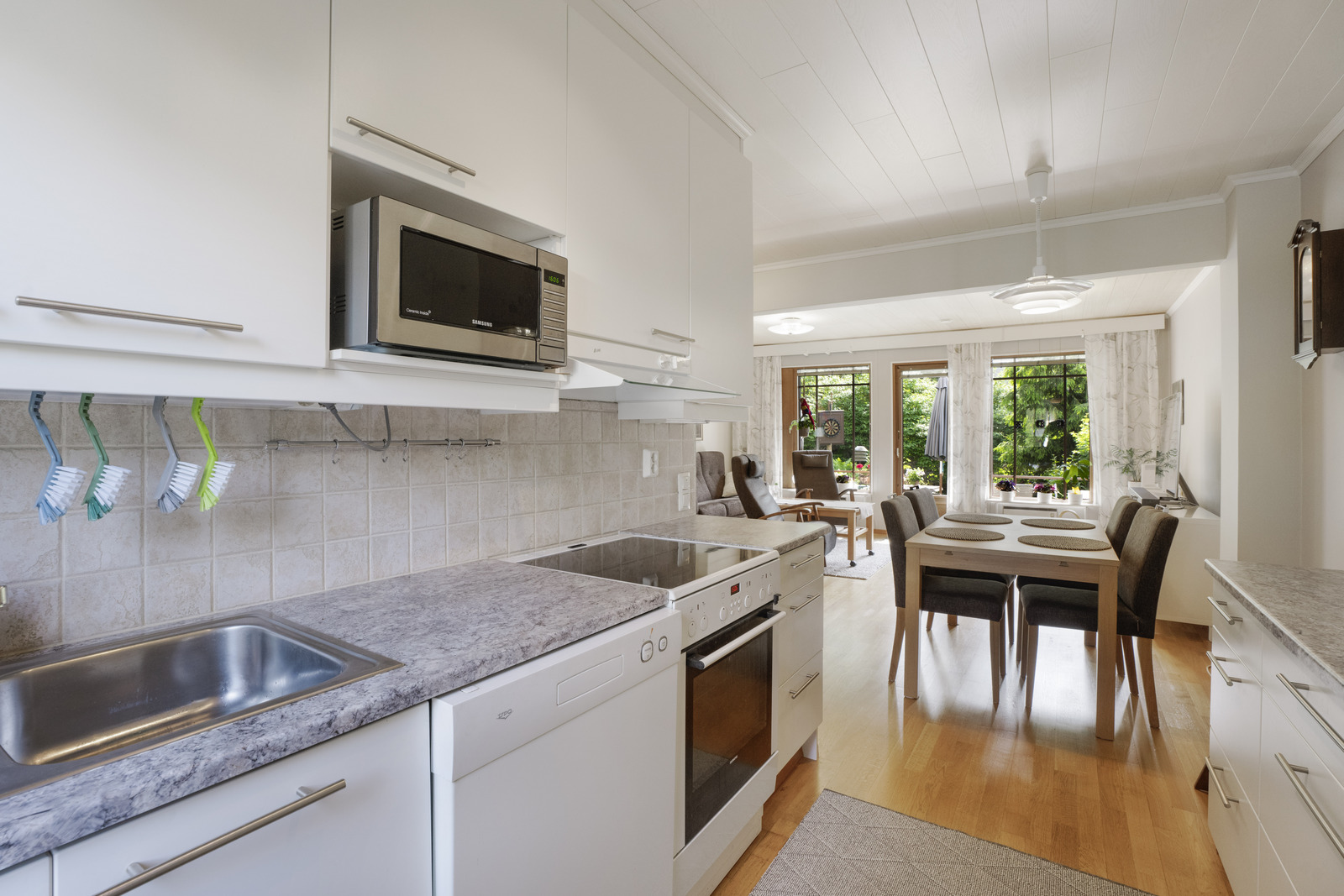 | Keittiön kuvaus | Liesi (Keraaminen liesi), työtasot (laminaatti), seinät (maali ja osalaatoitus), lattiat (parketti), liesituuletin, astianpesukone, jääkaappi ja erillinen pakastin |