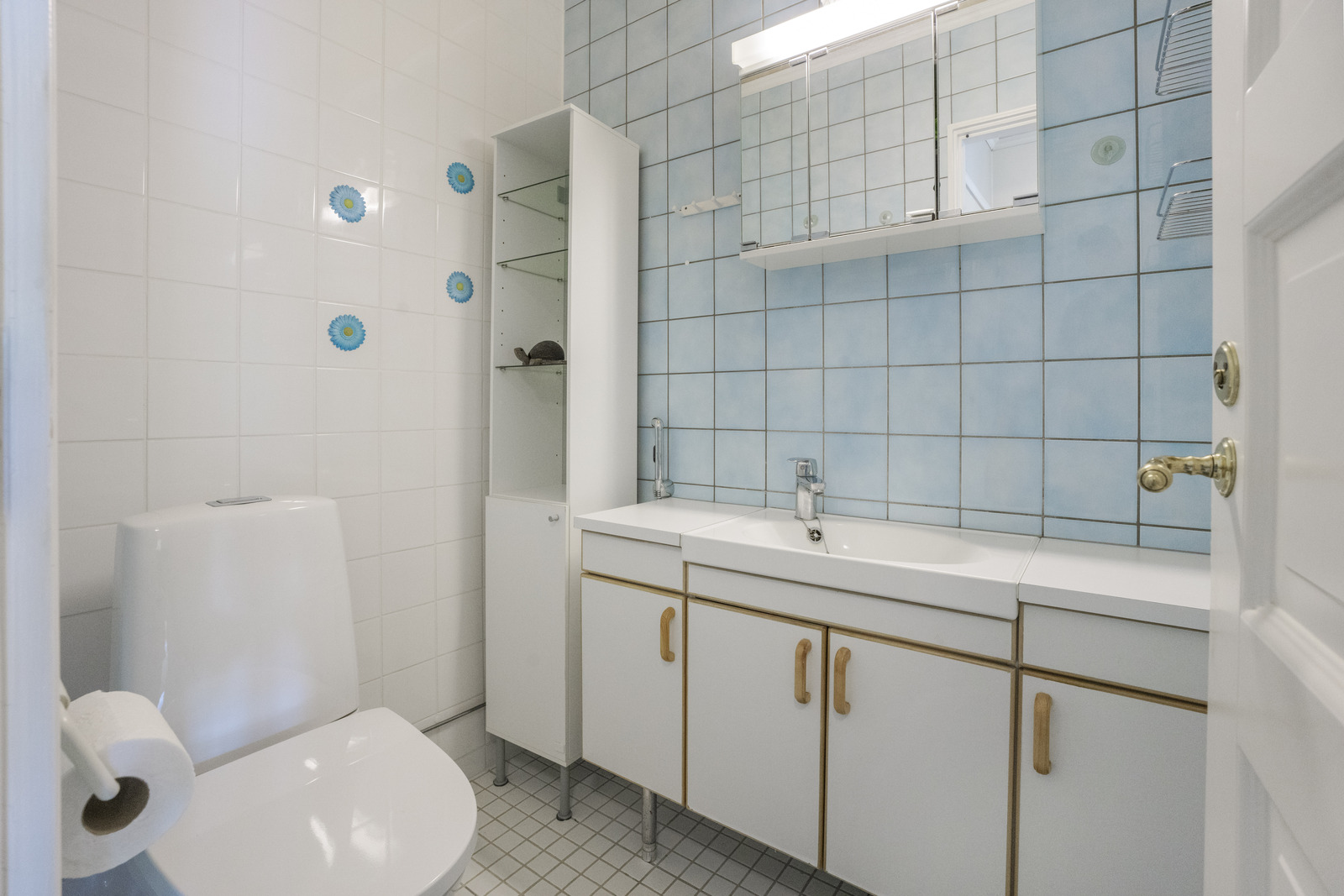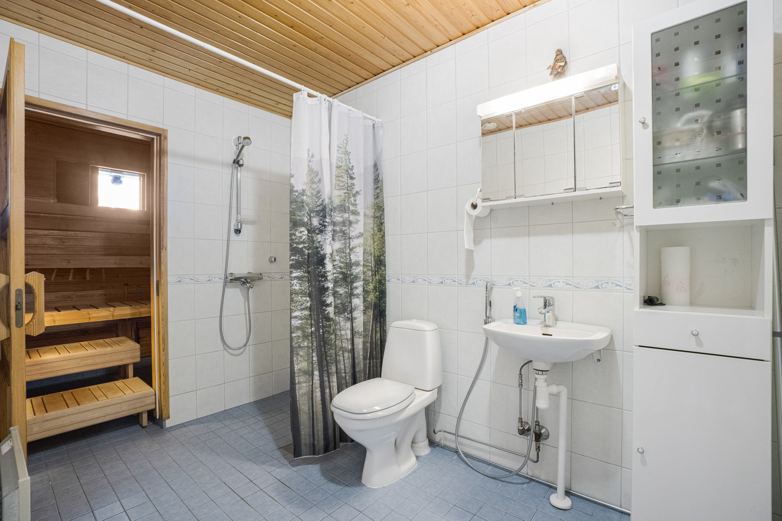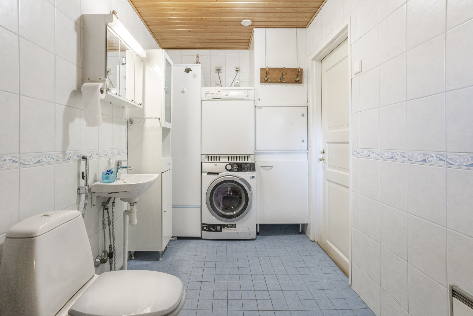 | Kylpyhuoneen kuvaus | WC-istuin, pesukoneliitäntä, lattialämmitys, peilikaappi ja suihku, seinät (kaakeli), lattiat (laatta) |