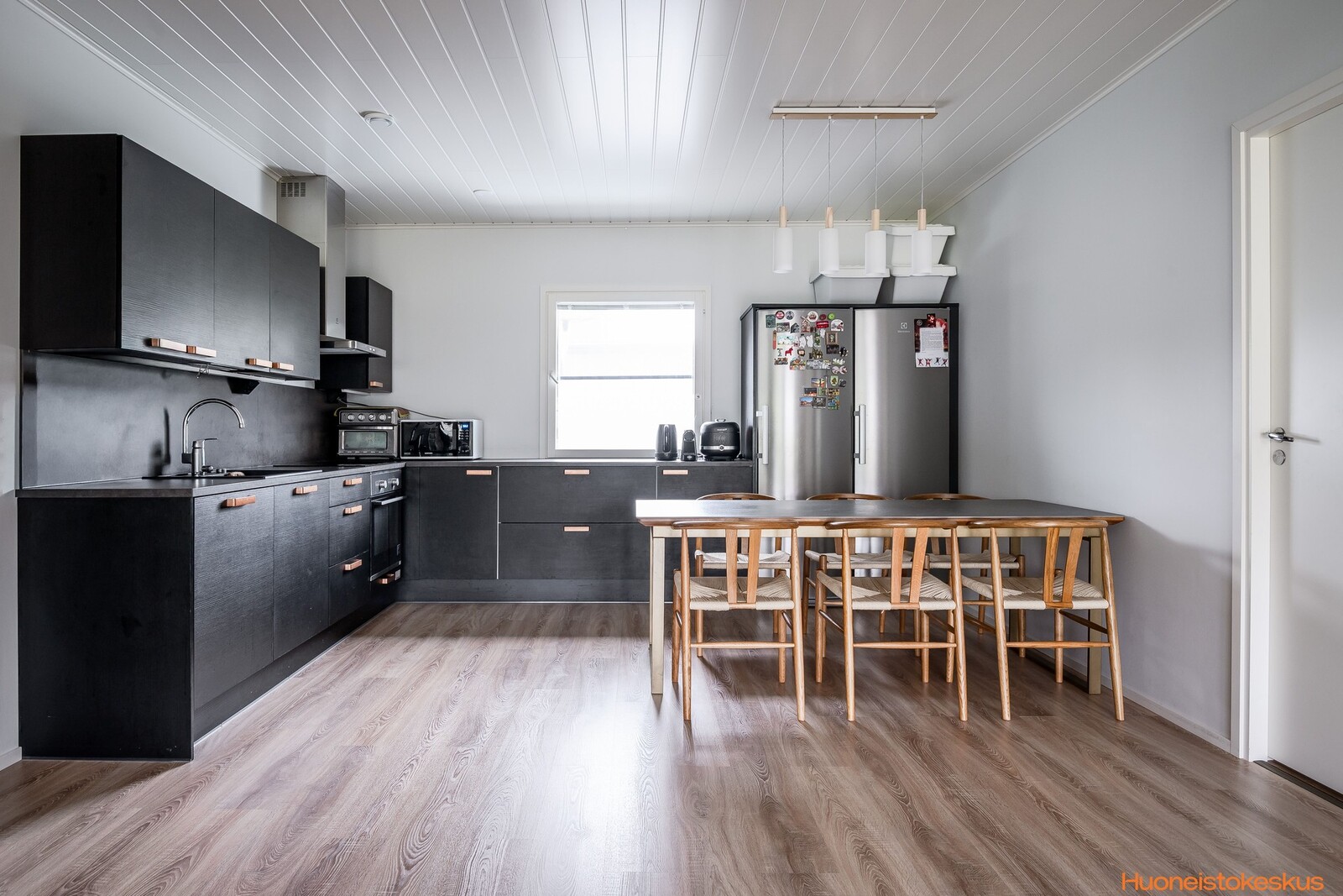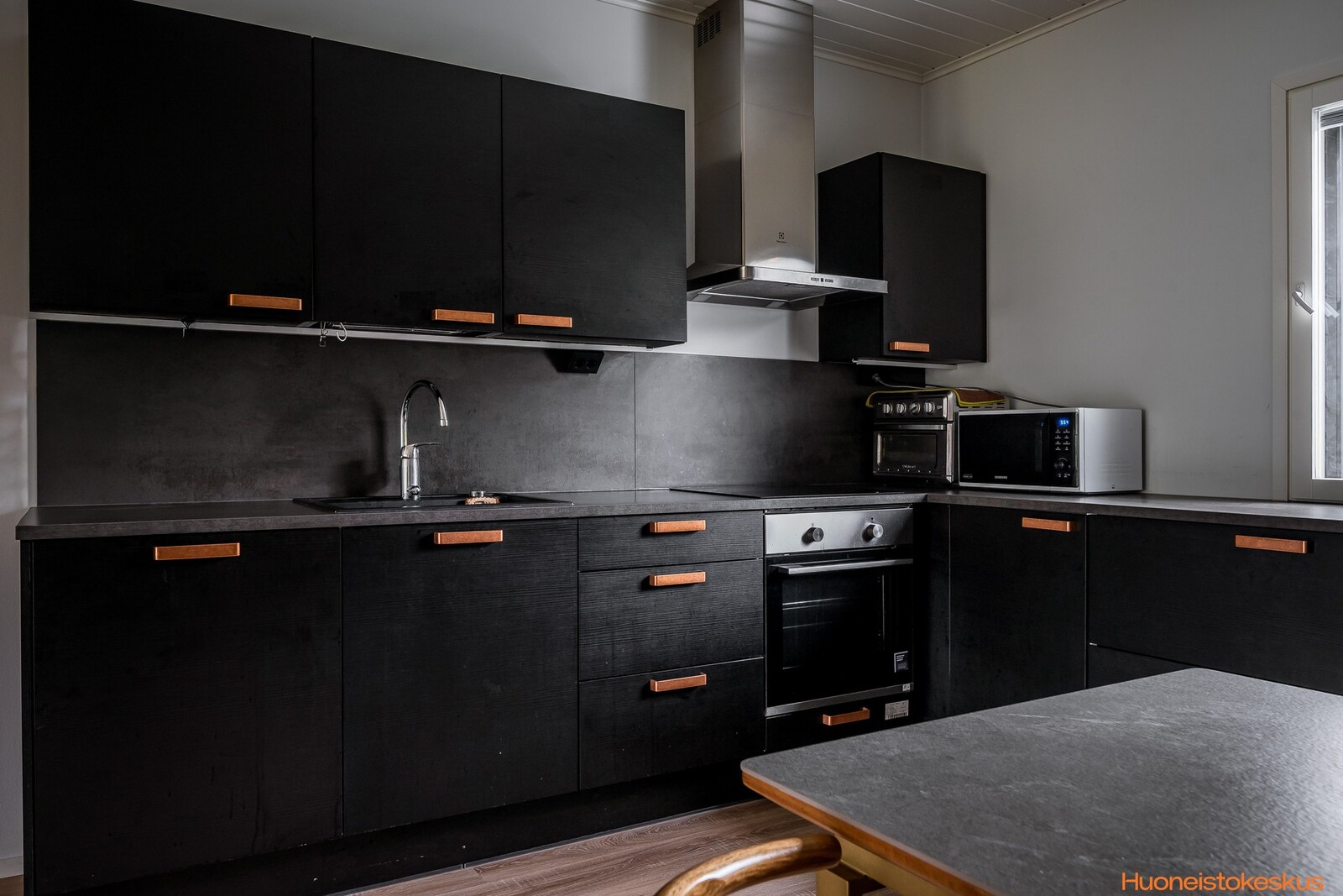 | Keittiön kuvaus | Liesi (Induktioliesi ja erillisuuni), työtasot (laminaatti), seinät (maali), lattiat (laminaatti), liesi, jääkaappi, erillisuuni, erillinen pakastin, astianpesukone ja liesituuletin / hormi |