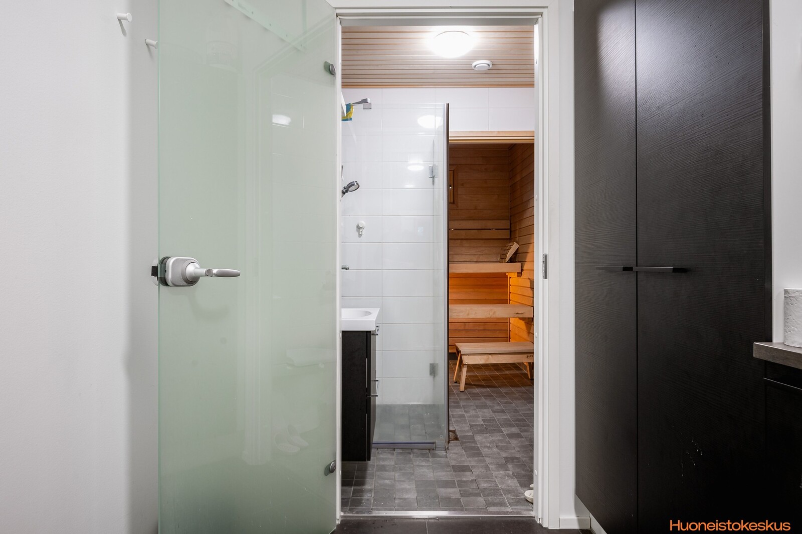| Kylpyhuoneen kuvaus | Peilikaappi, suihkuseinä, wc-istuin, suihku ja lattialämmitys, seinät (kaakeli), lattiat (laatta) |