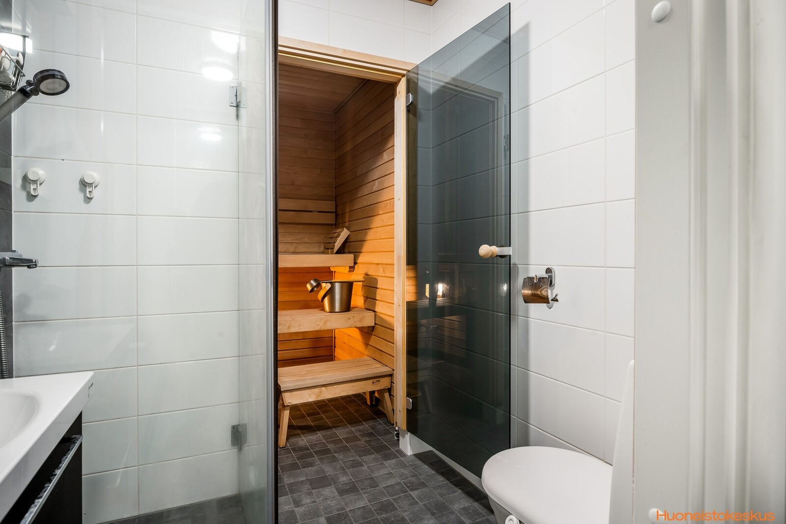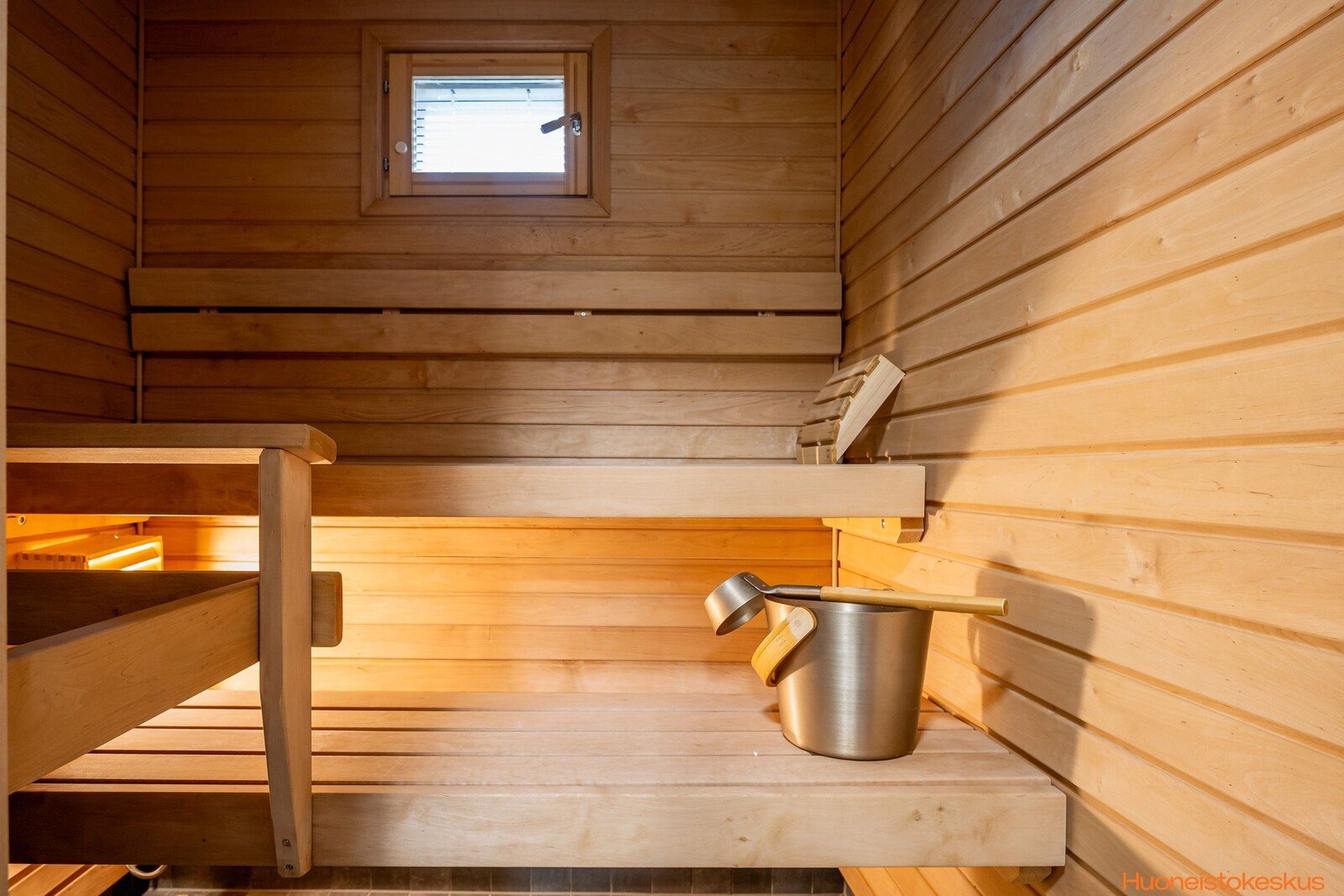 | Saunan kuvaus | Seinät (puu), lattiat (laatta), Sähkökiuas |