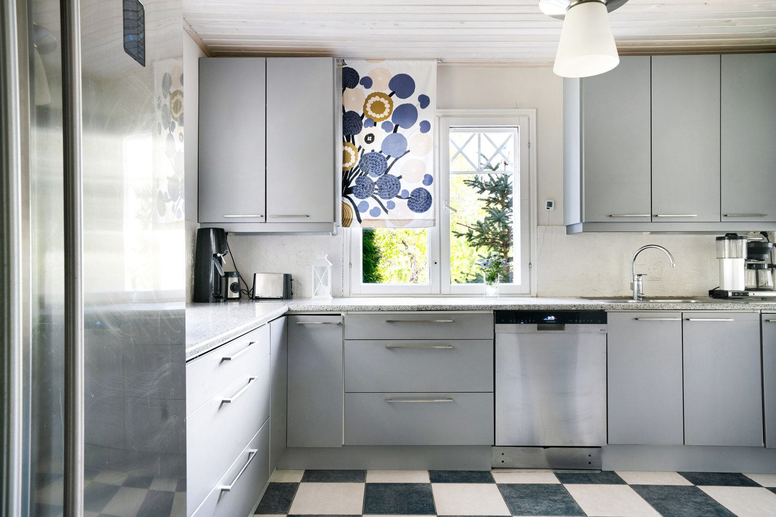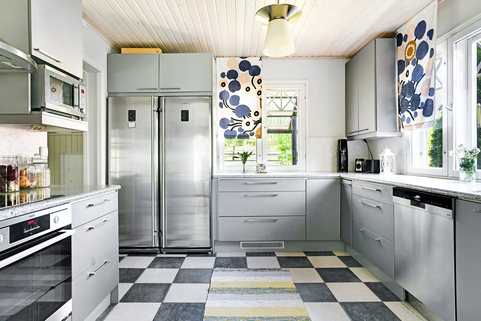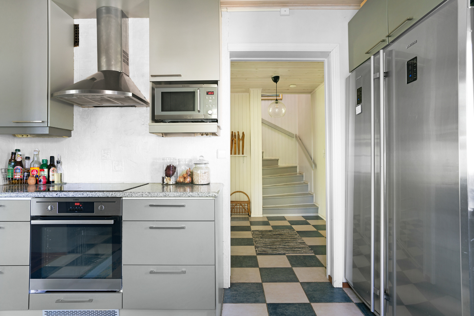 Liesi (Induktioliesi ja erillisuuni), työtasot (kivi), seinät (laatta ja tapetti), lattiat (laatta), astianpesukone, erillisuuni, erillinen pakastin, liesi, jääkaappi, mikroaaltouuni ja kiinteät valaisimet, liesituuletin / hormi |