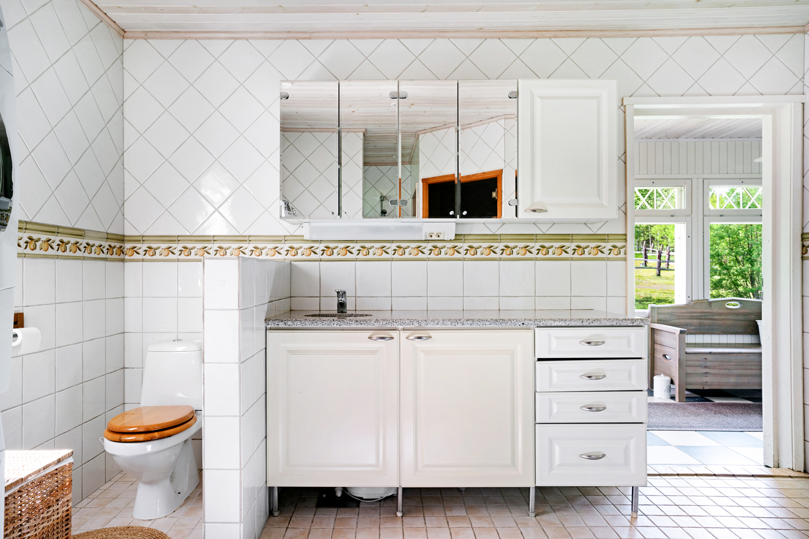 Lukumäärä: 2, Bidee-suihku, peilikaappi ja lattiakaivo, seinät (Tapetti ja kaakeli), lattiat (Laatta) |