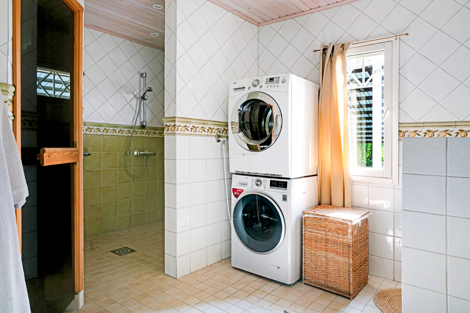 Allaskaappi, lattialämmitys, peilikaappi, pesukoneliitäntä, pesukone, suihku, wc-istuin, kuivausrumpu ja asennettuja erikoisvarusteita, kiinteät valaisimet, seinät (kaakeli), lattiat (laatta) |