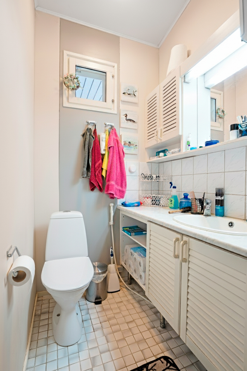 Lukumäärä: 2, Bidee-suihku, lattialämmitys ja peilikaappi, seinät (Maali), lattiat (Laatta) |
