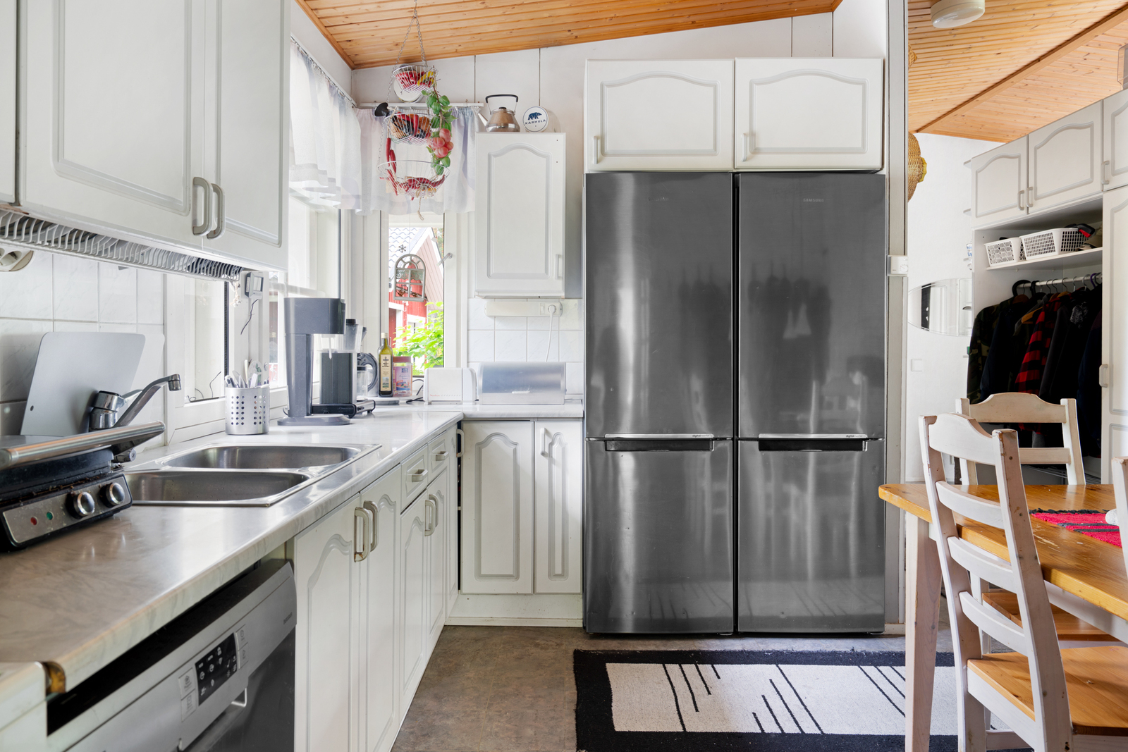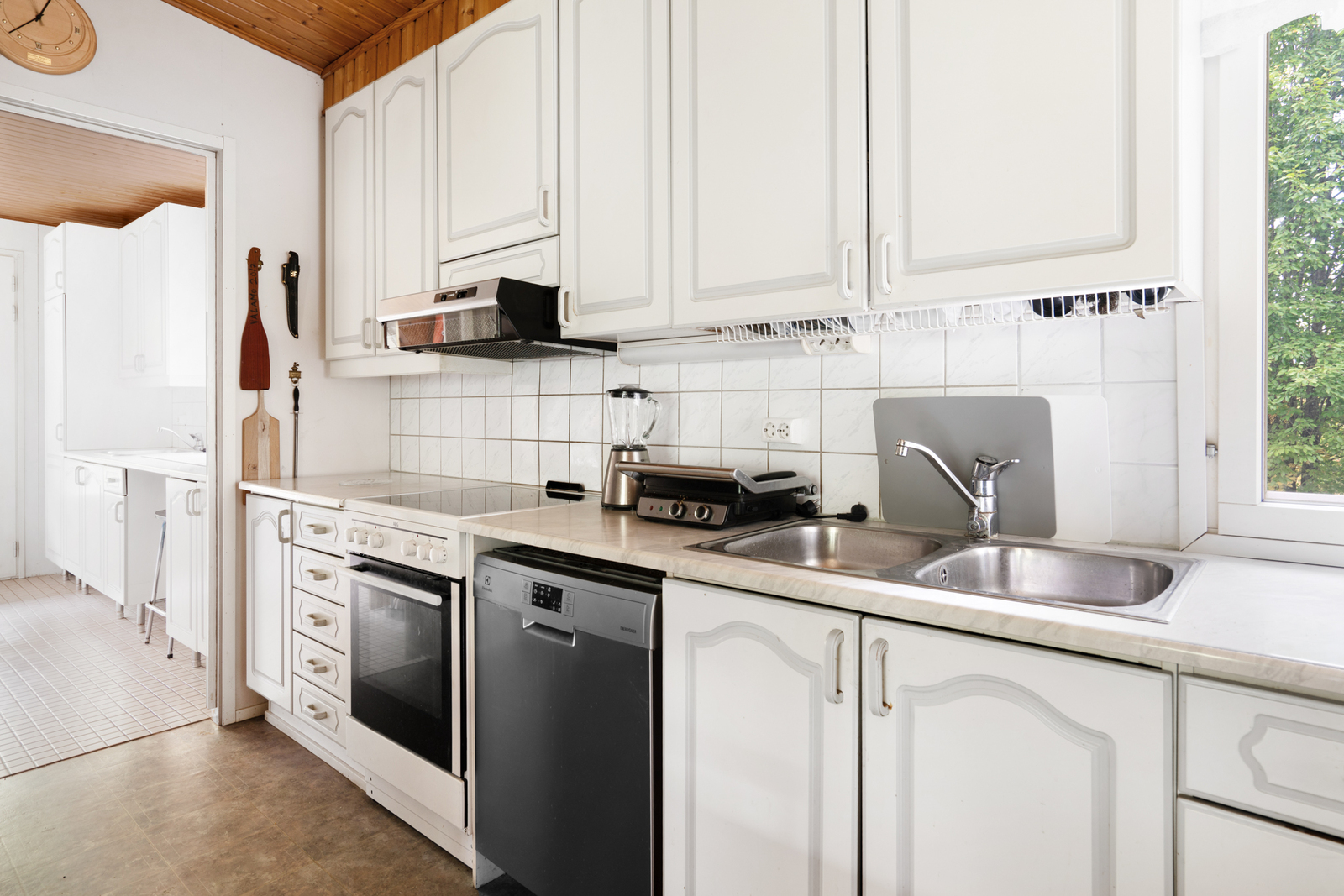 Liesi (Keraaminen liesi ja leivinuuni), työtasot (laminaatti), seinät (maali), lattiat (muovimatto), uuni, jääkaappipakastin, astianpesukone, liesituuletin ja kiinteät valaisimet |