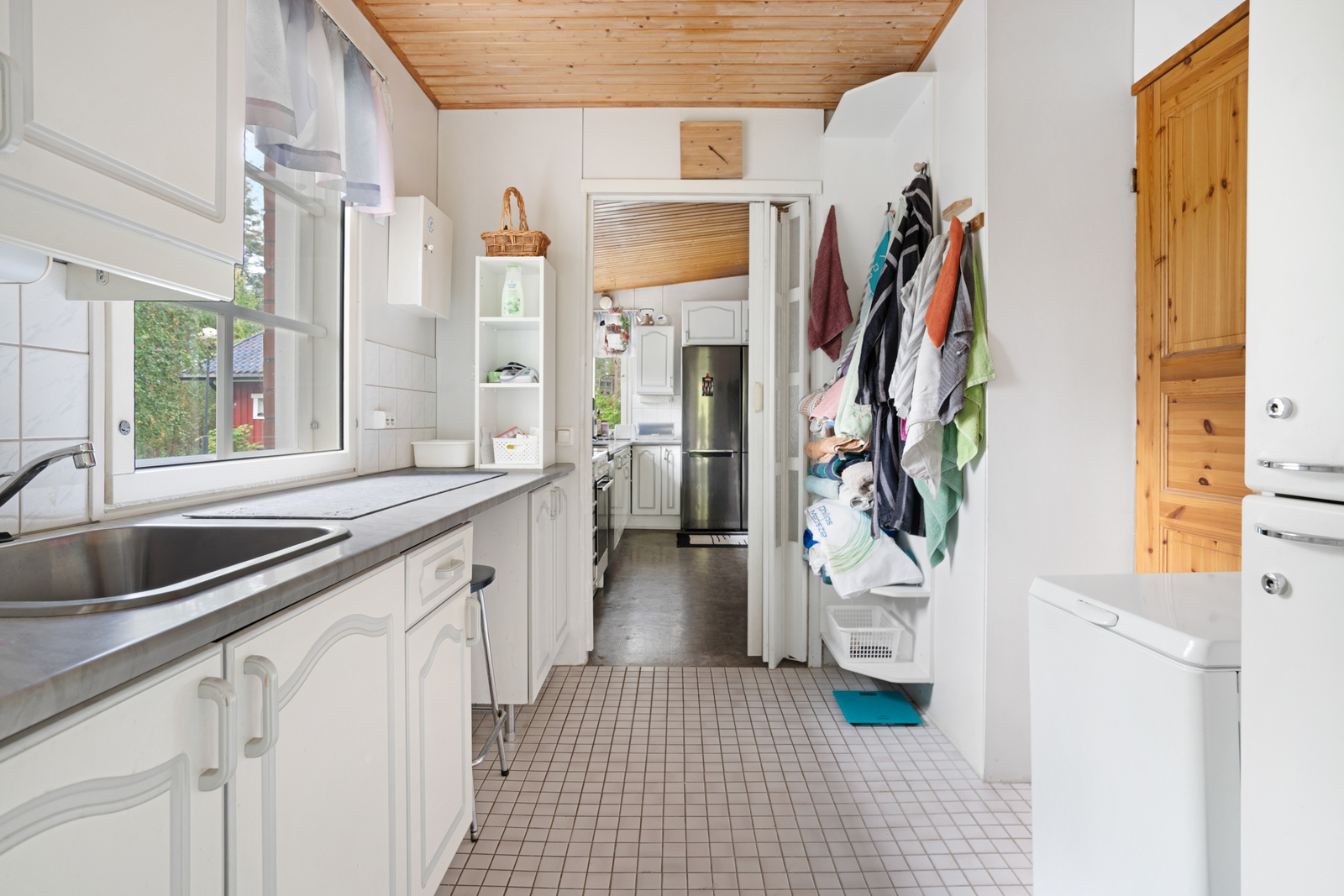 Pesuallas, lattialämmitys, pesukoneliitäntä, pyykkikaapit ja pöytätaso, lattiat (laatta), seinät (maali) |