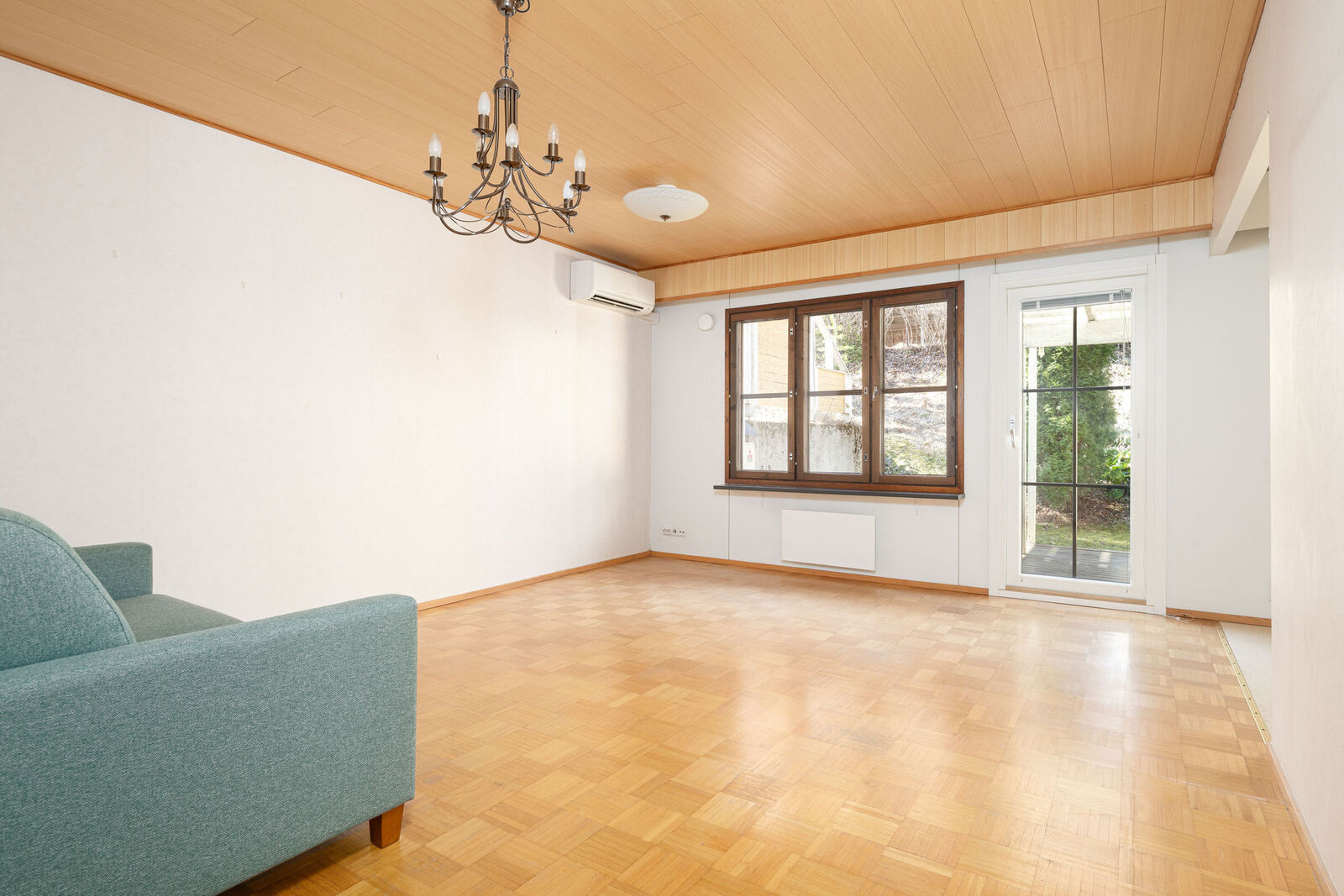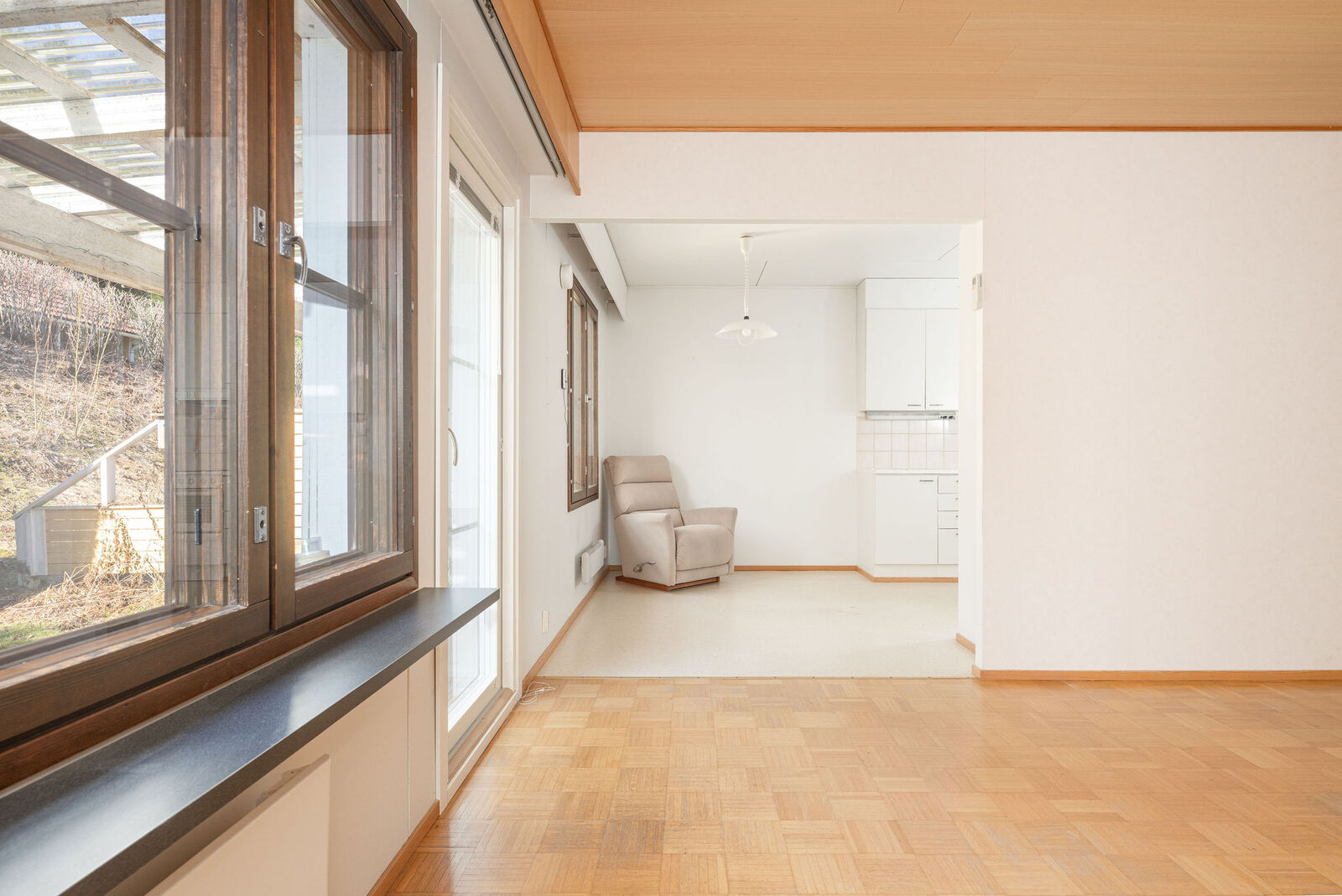 Lattiat (parketti), valoisa olohuone, josta kulku tapapihalle |