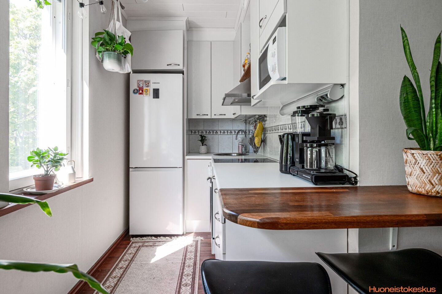 Liesi (Keraaminen liesi), työtasot (laminaatti), seinät (maali), lattiat (laminaatti), jääkaappipakastin, mikroaaltouuni ja liesituuletin |