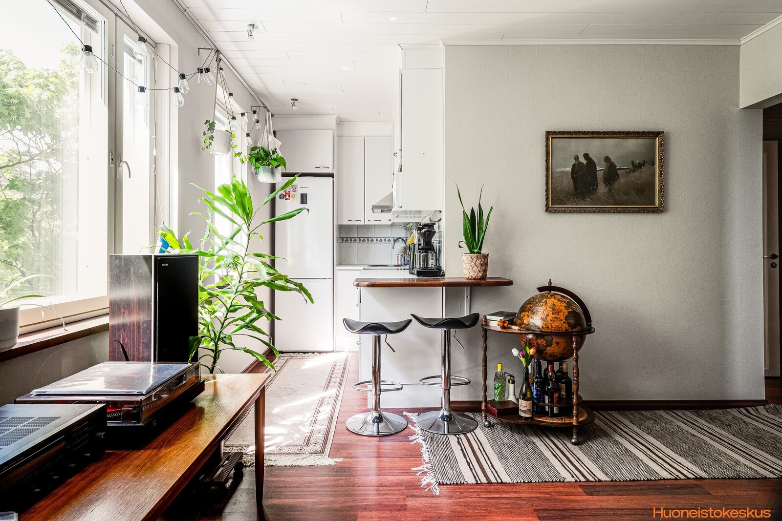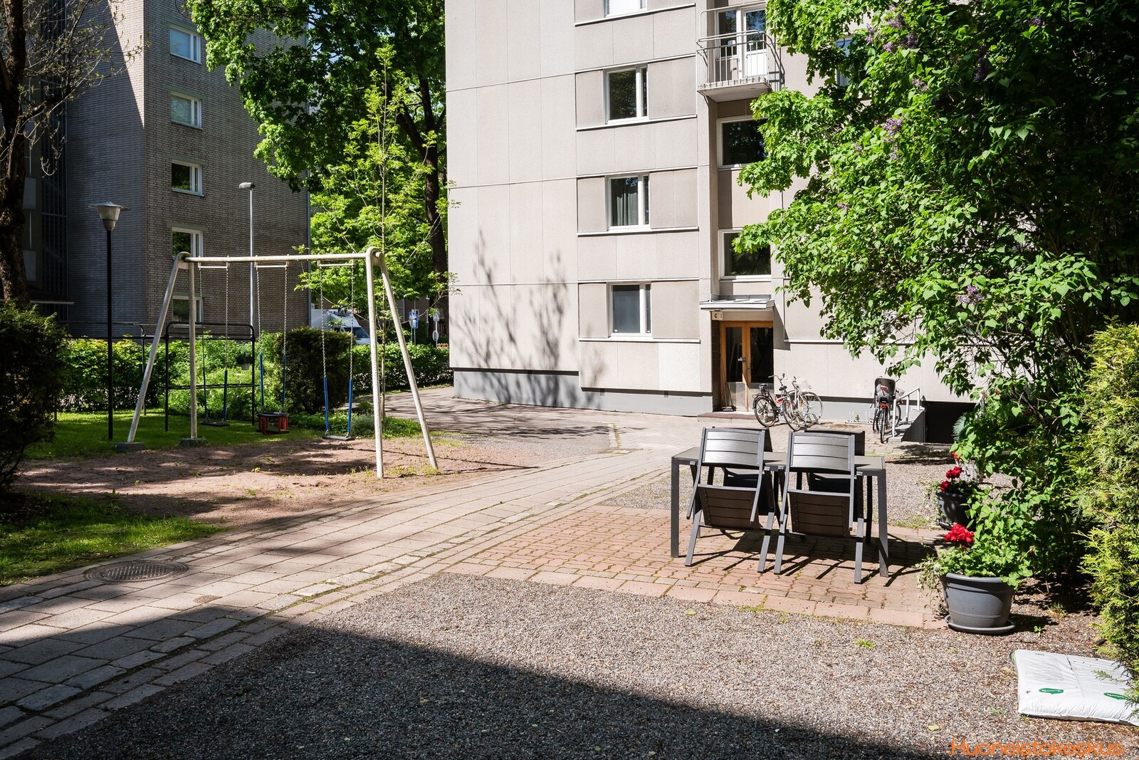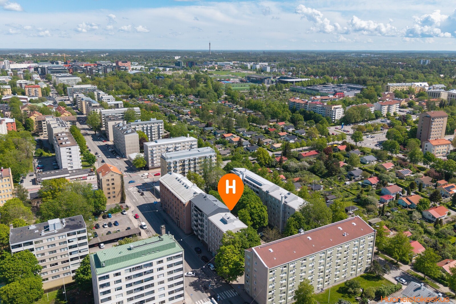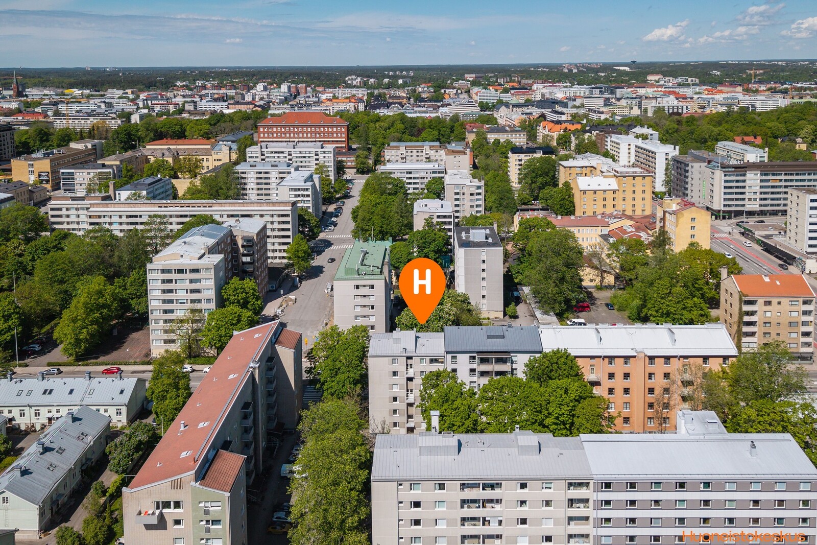Erinomaisella paikalla, 6.kerroksen hyväkuntoinen, kompakti kaksio, missä tilat neliöitään suuremmat. Olohuoneesta ja keittokomerosta avautuvat isot ikkunat tuovat mukavasti valoa ja kauniit puut luovat idyllisen tunnelman näin kesäaikaan, kun ne ovat vehreimmillään. Kylpyhuone on laatoitettu taloyhtiön putkiremontin aikaan, muuten asunto on käynyt läpi remontin v. 2007 niin pinnoiltaan kuin myös keittokomeron kaapistot ja kodinkoneet uusittu. Taloyhtiö on hyvinhoidettu ja se on omalla tontilla. Asunto on vuokrattu, irtisanomisaika hvl:n mukaan 6 kk.
