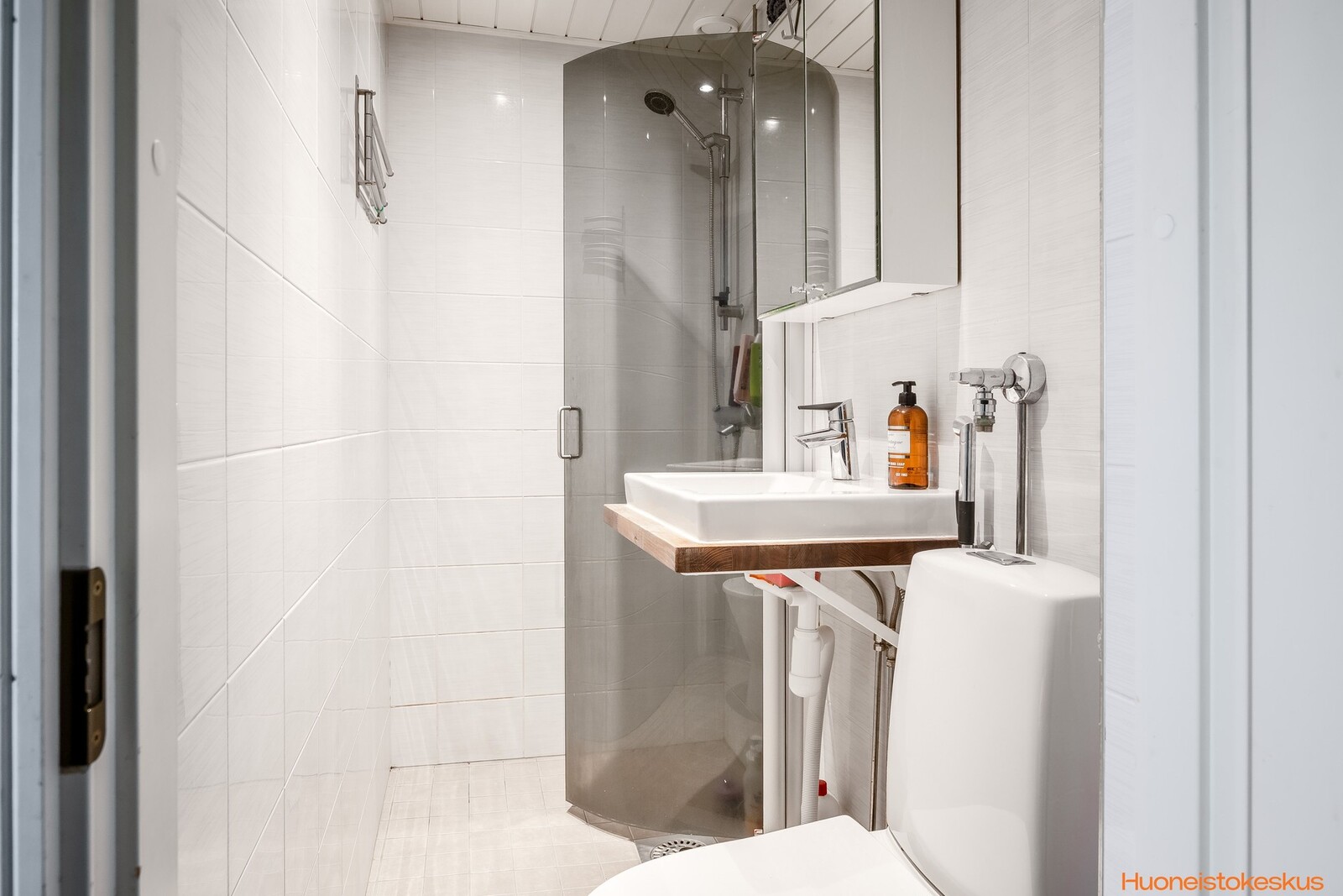 Pesukoneliitäntä, suihkuseinä, peilikaappi, suihku ja wc-istuin, seinät (kaakeli), lattiat (laatta) |
