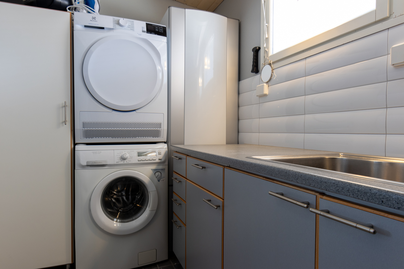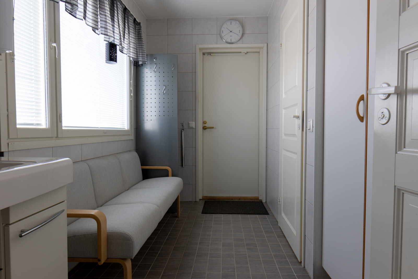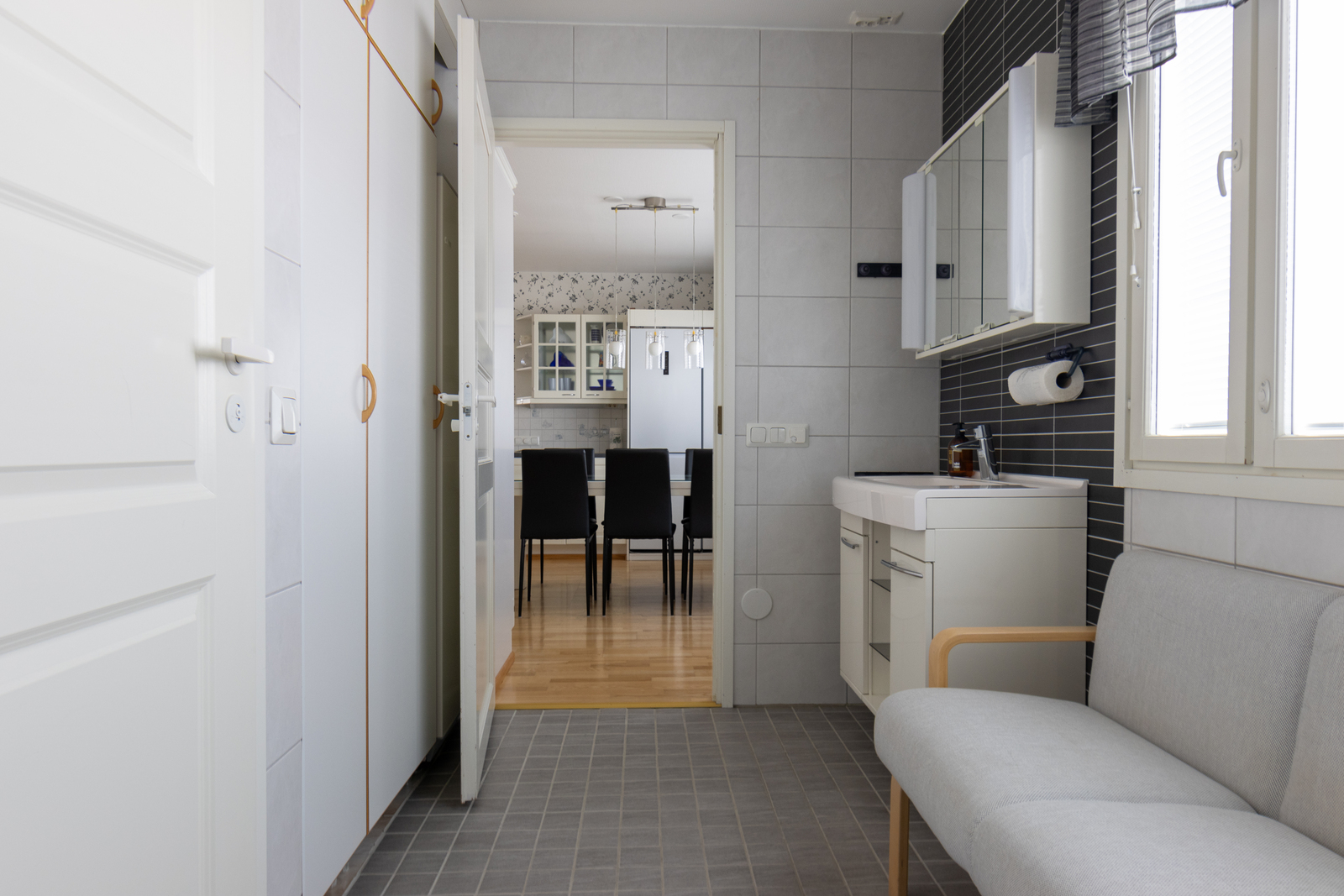 | Kodinhoitohuoneen kuvaus | Lattialämmitys, lattiakaivo, pesukoneliitäntä ja pesukone, lattiat (laatta), seinät (kaakeli) |