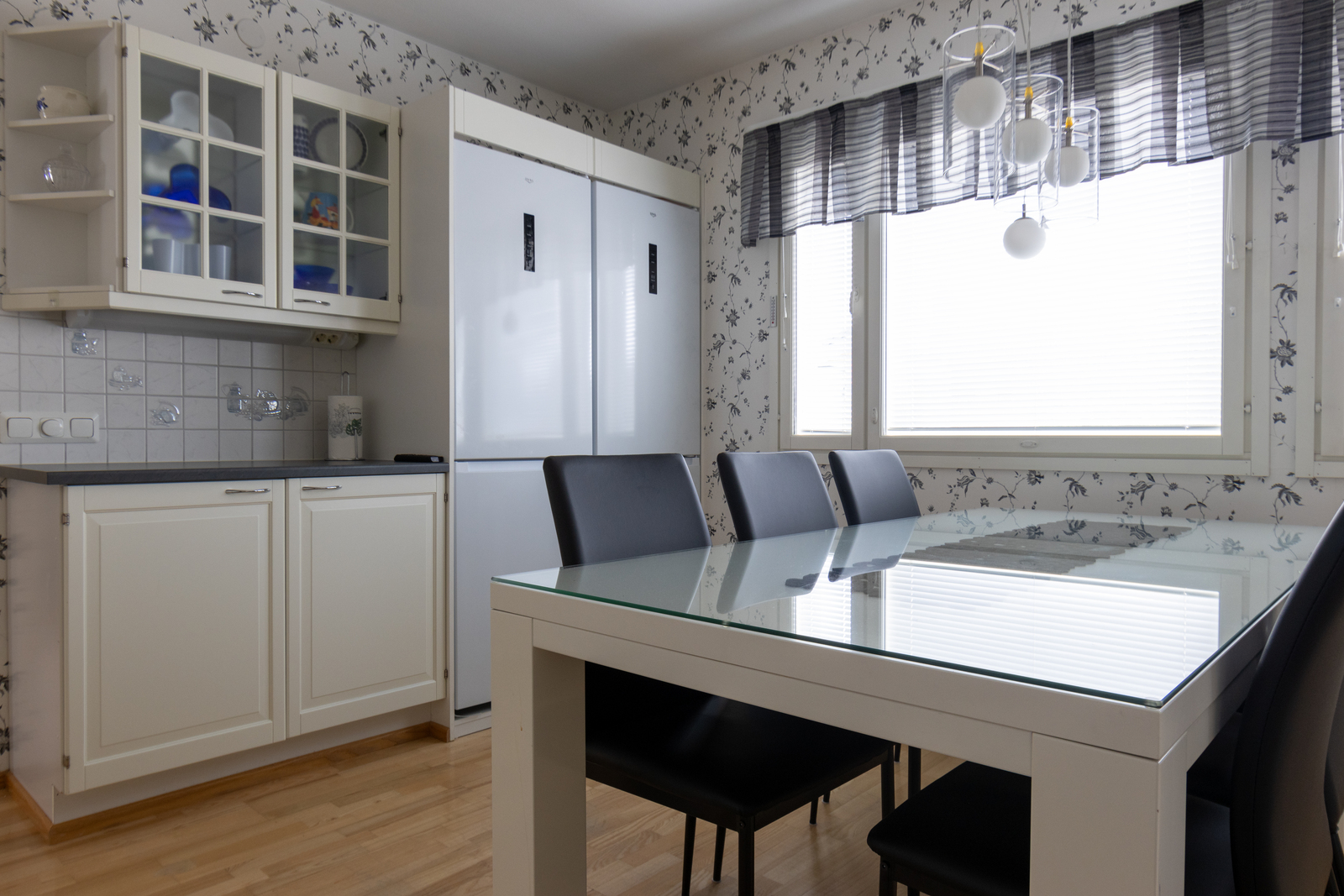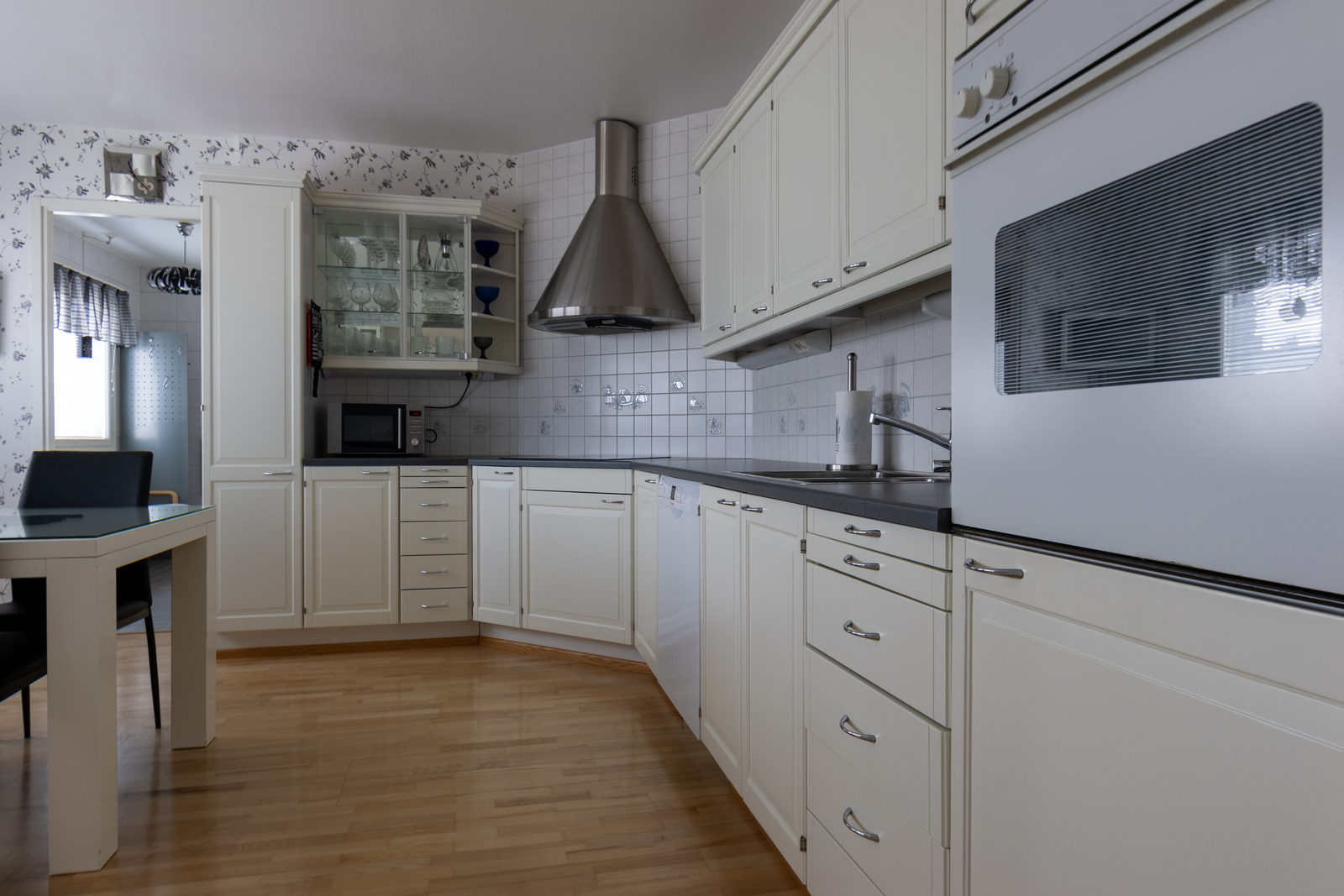 | Keittiön kuvaus | Liesi (Induktioliesi ja erillisuuni), työtasot (laminaatti), seinät (tapetti), lattiat (parketti), erillisuuni, liesi, jääkaappi, mikroaaltouuni, astianpesukone, erillinen pakastin ja liesituuletin / hormi, kiinteät valaisimet |