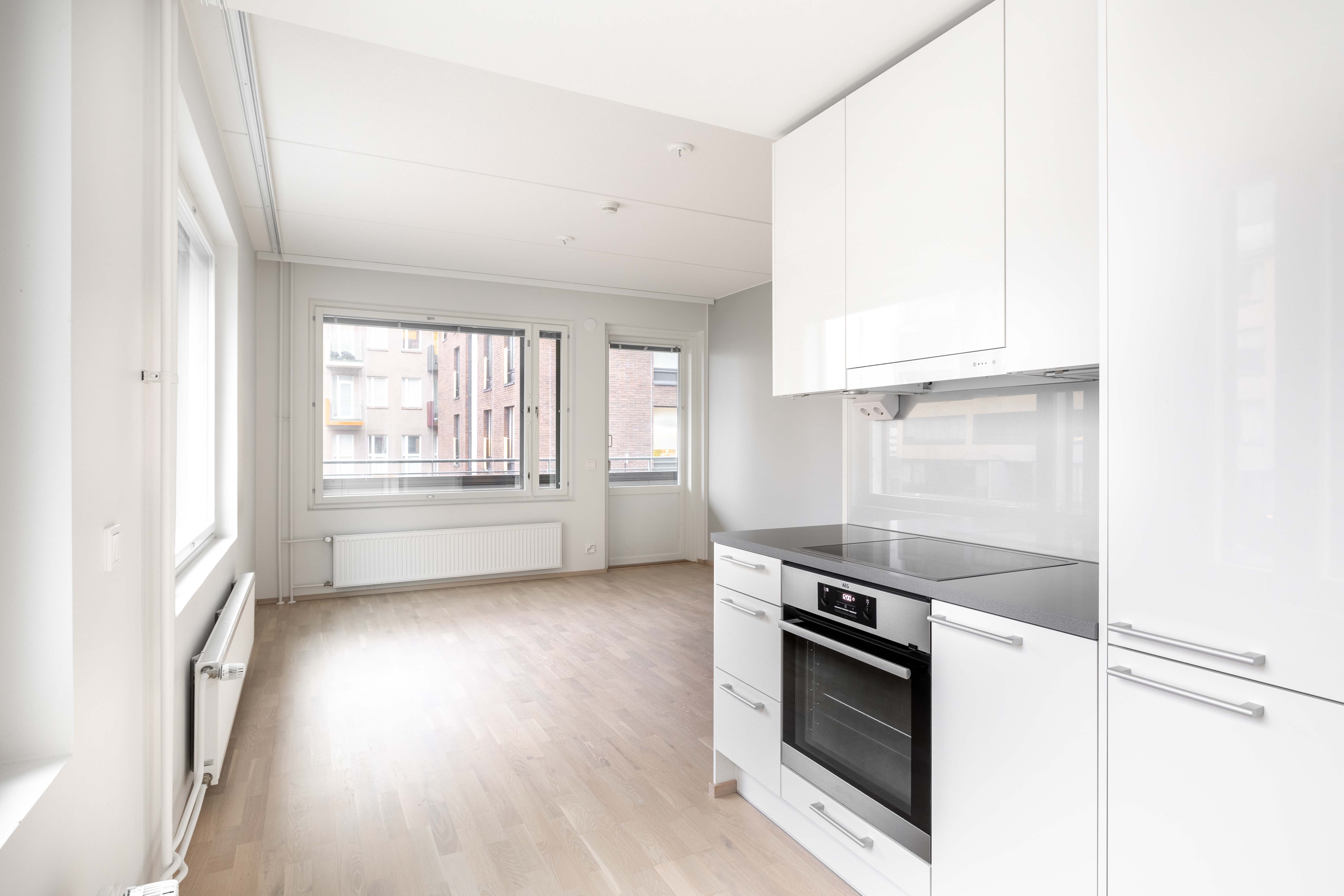 | Keittiön kuvaus | Liesi (Induktioliesi), työtasot (laminaatti), seinät (maali), lattiat (parketti), jääkaappipakastin (AEG), mikroaaltouuni (AEG), astianpesukone (kapea malli AEG), erillisuuni (AEG) ja liesituuletin, keittiö on osittain avoin olohuoneeseen kaapistot matta valkoinen |