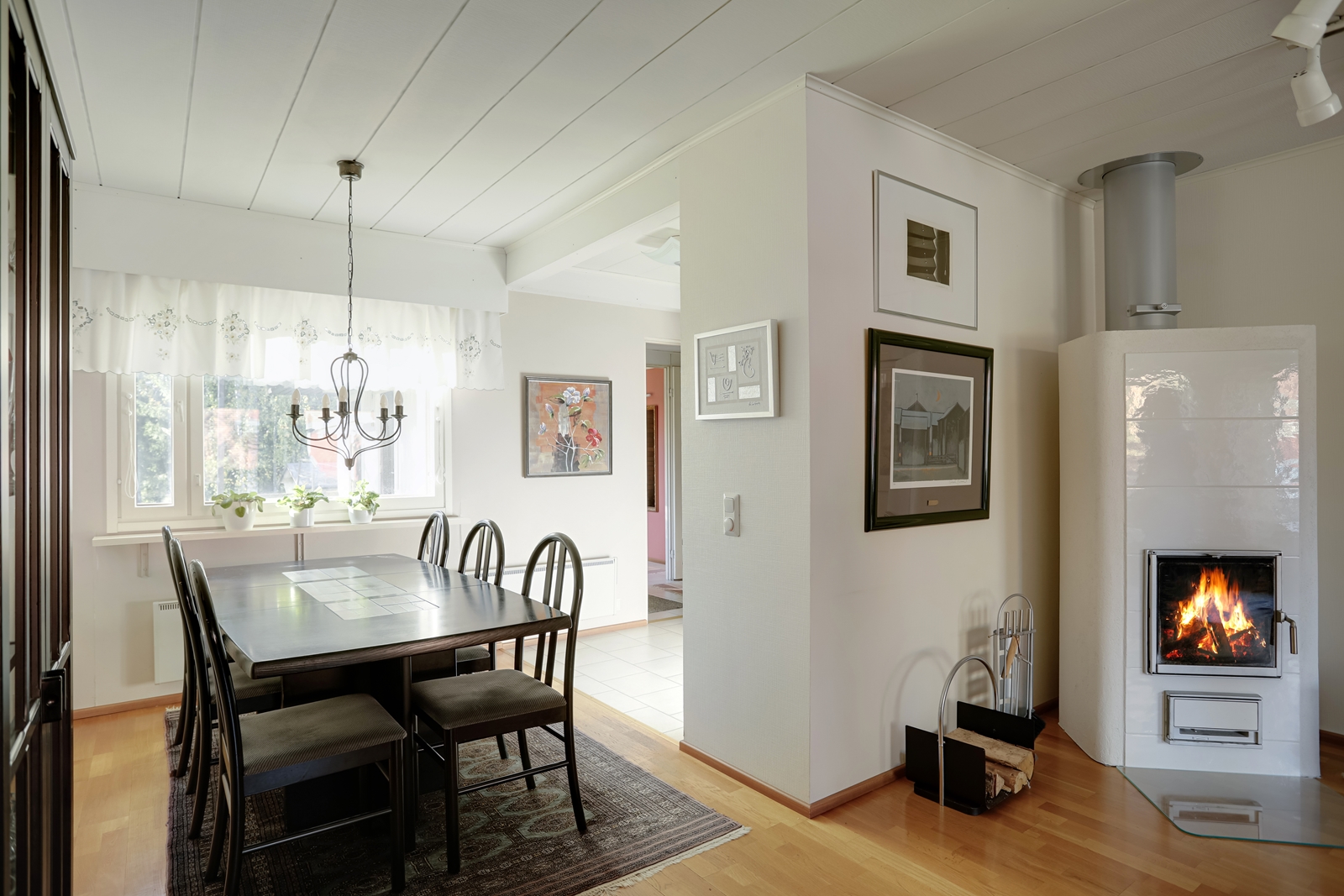 Talossa on kolme makuuhuonetta, avara olohuone ja ruokailutila sekä takkahuone saunaosaston yhteydessä.