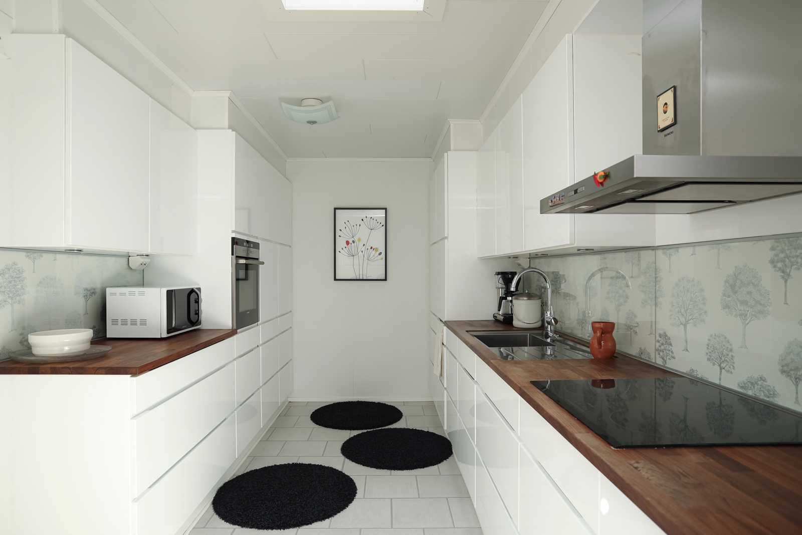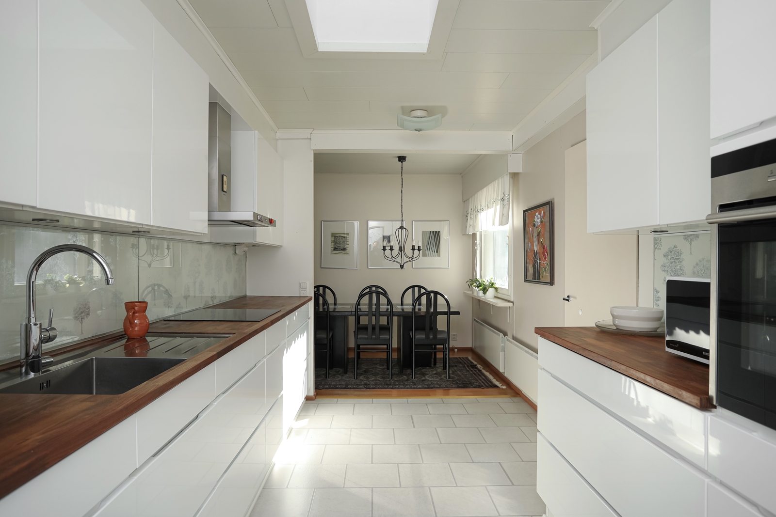 Keittiö on remontoitu vuonna 2015 ja se on varustettu nykyaikaisilla laitteilla, kuten induktioliedellä ja erillisellä uunilla. Laitteet on integroitu ja kaappitilaa on runsaasti.