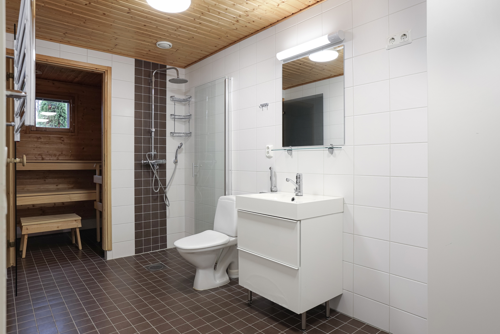 | Saunan kuvaus | Seinät (puu), lattiat (laatta), Sähkökiuas |