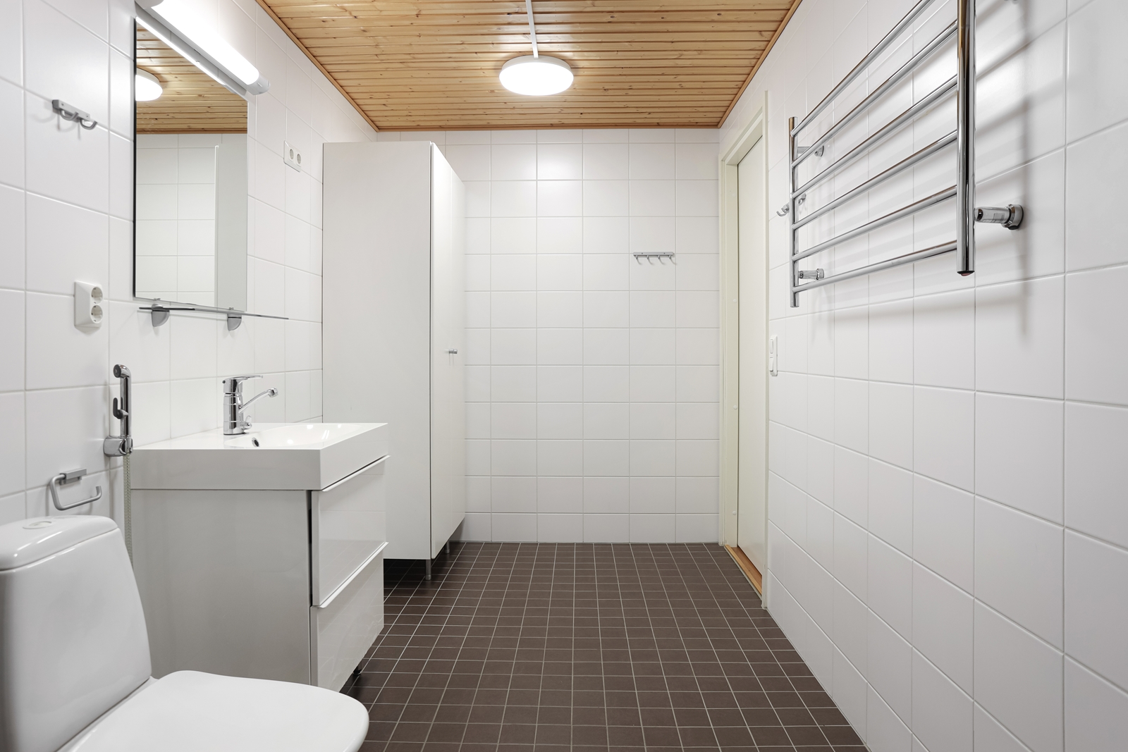 | Kylpyhuoneen kuvaus | WC-istuin, suihku, pesukoneliitäntä, lattialämmitys, peilikaappi ja pesuallas, seinät (kaakeli), lattiat (laatta) |