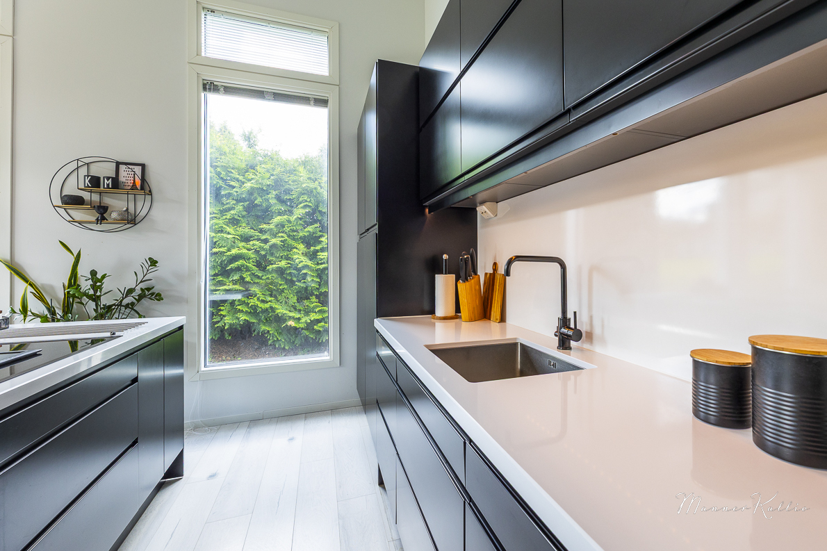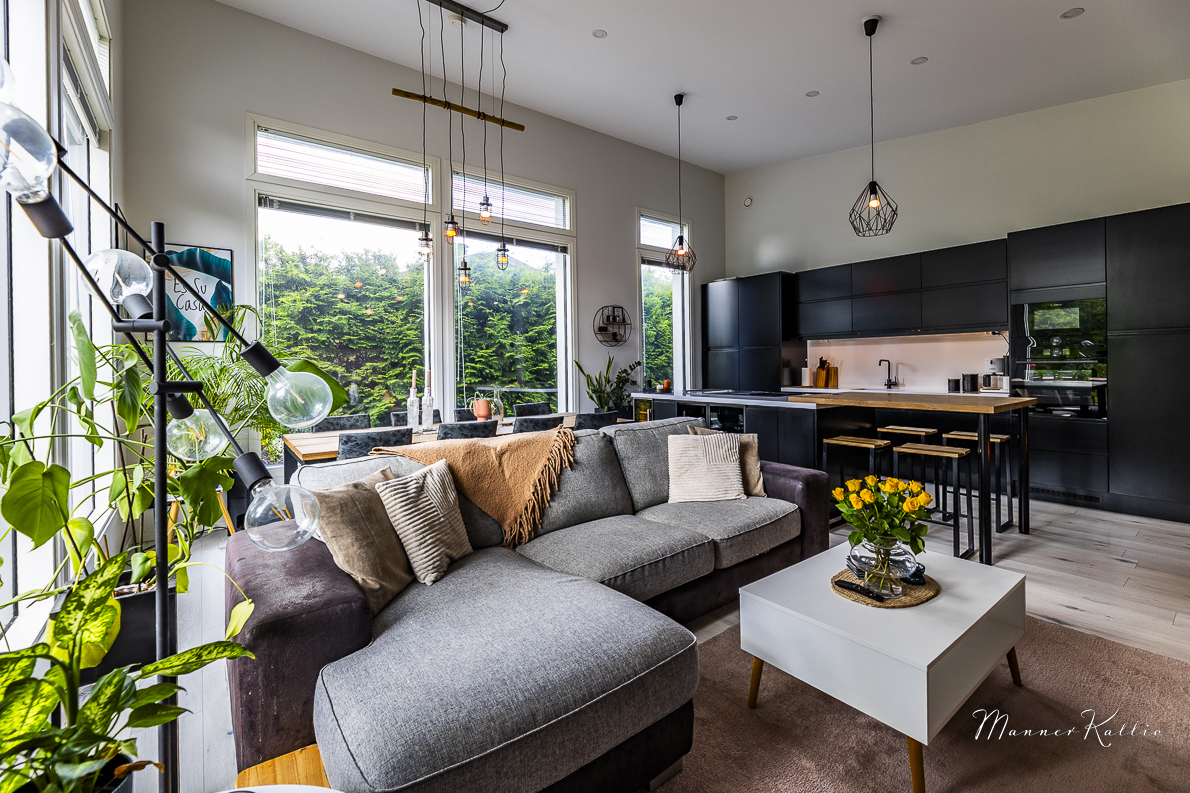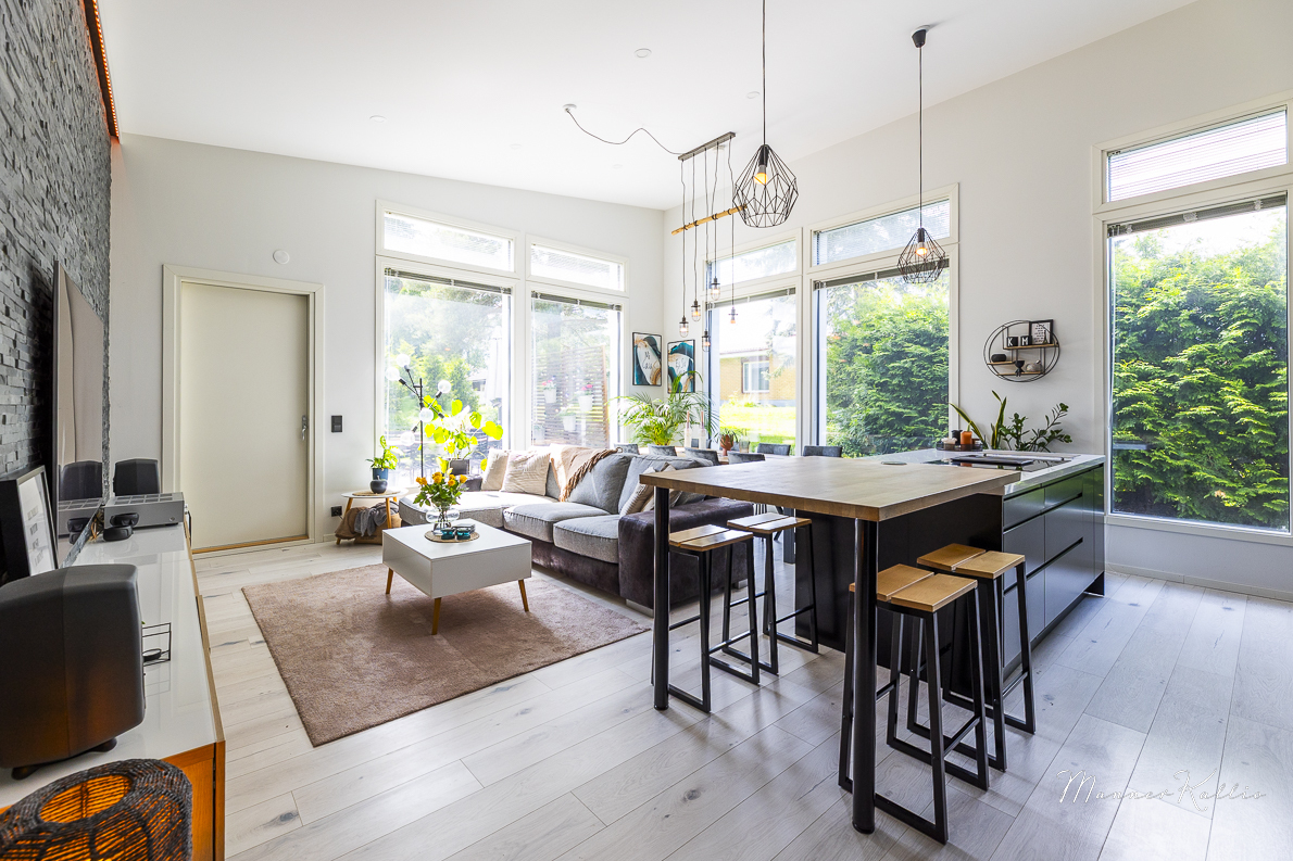 Kodin sydän on korkea ja valoisa olohuone, joka yhdistyy saumattomasti keittiöön. Keittiössä katseen vangitsee näyttävä kvartsikivi-saareke, ja käytössä ovat laadukkaat, integroidut kodinkoneet. Tyylikäs kokonaisuus täyttää vaativammankin asujan toiveet.