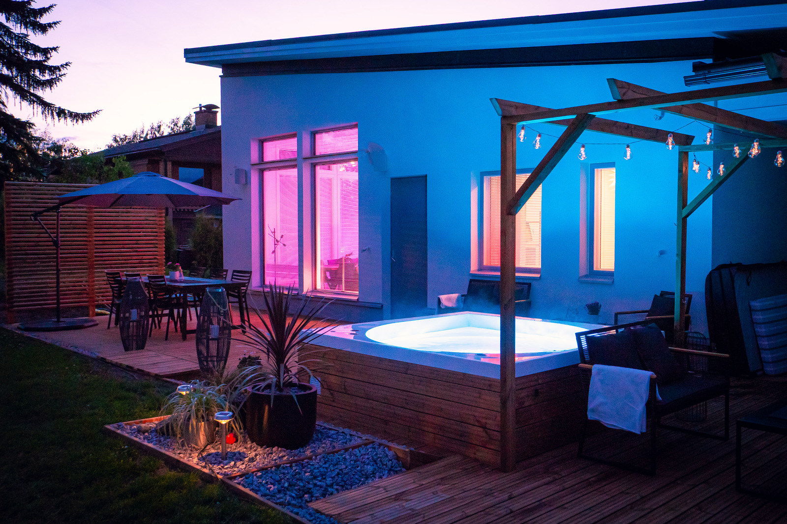 | Muuta kauppaan kuuluvaa | Kaapistot (Olohuoneen seinällä oleva iso kaapisto ja eteisen kaapisto), sälekaihtimet/rullaverhot, kiinteät valaisimet (Kaikki kiinteät valaisimet himmennettäviä ja bluetooth-ohjattavia.Osa epäsuorista valoista Philips Hue ohjattuja. Ohjaus jää, johon on helppo liittää irrallisia Hue-valaismia.), lämminvesivaraaja, jätesäiliö, istutukset. Poreamme Drop Desing Pool. |