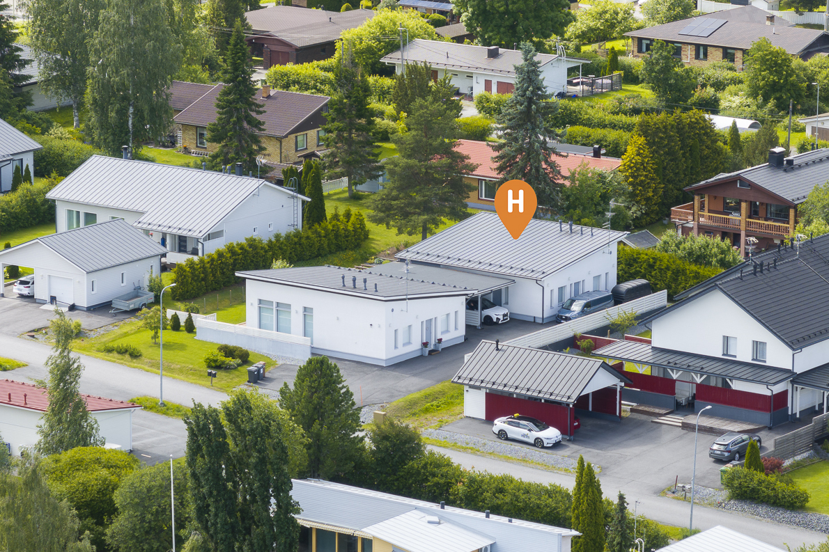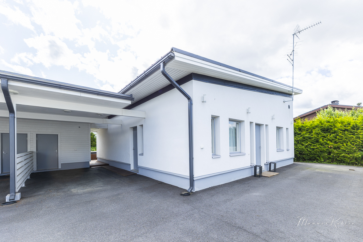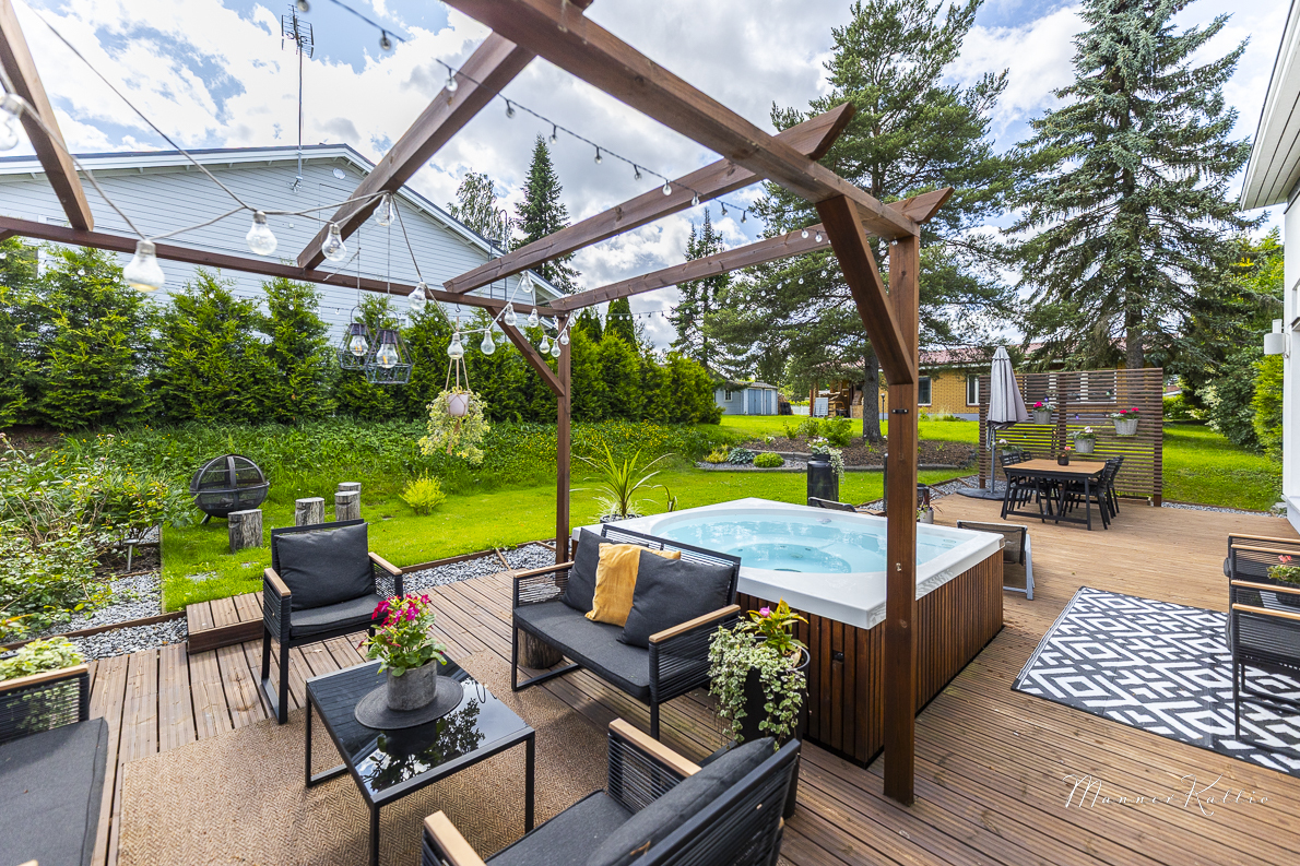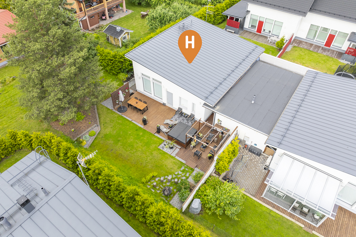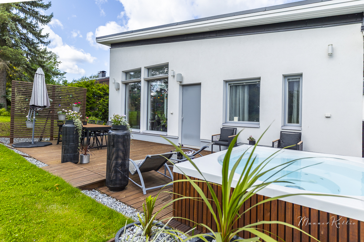 Lämmitys hoituu energiatehokkaasti maalämmöllä, ja kesähelteillä asumismukavuuden takaa viilentävä maaviileä. Säilytystilaa löytyy runsaasti, ja arkea helpottavat sekä lämmin ulkovarasto että käytännöllinen kodinhoitohuone, josta on käynti suoraan ulos. Lisäksi käytössäsi on autokatos yhdelle autolle sekä toinen pihapaikka. Etelän puoleinen, suuri terassi on täydellinen paikka rentoutumiseen – varustettu tyylikkäällä Drop Design Pool -ulkoporealtaalla. Piha-alue on suojaisa ja viimeistelty, joten koti jatkuu saumattomasti ulkotiloihin.