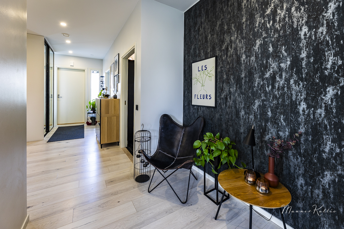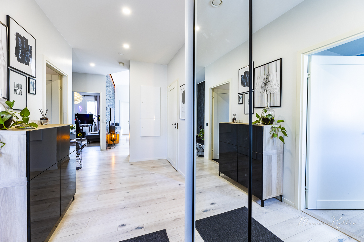 Kodin pohjaratkaisu on huolellisesti suunniteltu: kolme makuuhuonetta, tilava ja näyttävä olohuone-keittiö yhdistelmä, oma saunaosasto, erillinen wc, kodinhoitohuone omalla sisäänkäynnillä, vaatehuone sekä suuri, etelään avautuva terassi tekevät arjesta sujuvaa ja viihtyisää.