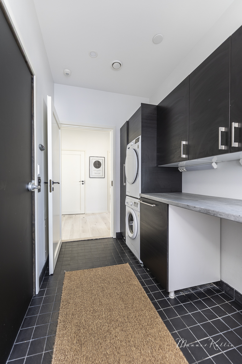 | Kodinhoitohuoneen kuvaus | Lattialämmitys, pyykkikaapit, lattiakaivo, pöytätaso ja pesukoneliitäntä, lattiat (laatta), seinät (maali) |