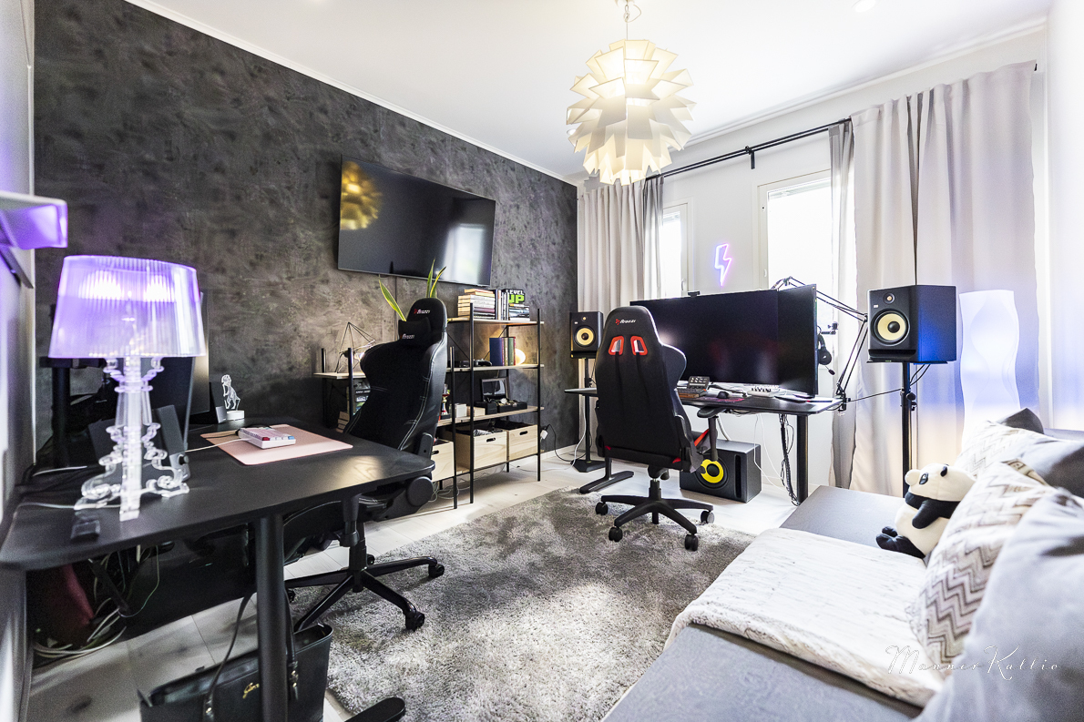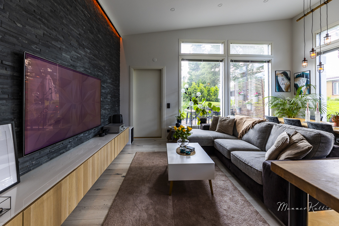 | Olohuoneen kuvaus | Seinät (maali ja kivi), lattiat (laminaatti) |