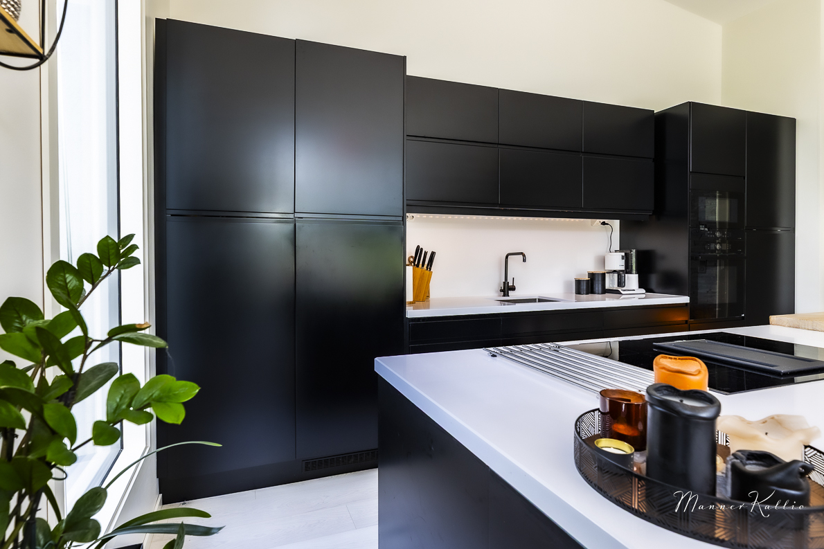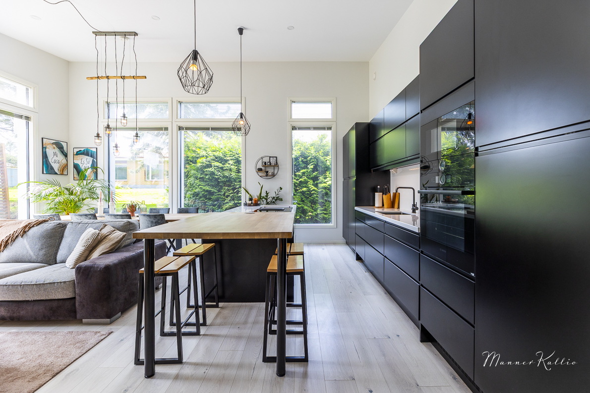 | Keittiön kuvaus | Liesi (Induktioliesi), työtasot (kvartsikomposiitti ja massiivitammi), seinät (maali), lattiat (laminaatti), erillisuuni (Bosch), jääkaappi (Bosch, täysikorkea), erillinen pakastin (Bosch, puolikorkea), mikroaaltouuni (Bosch), astianpesukone (Bosch), liesi (Bosch, intergoitu liesituuletin), keittiösaareke ja viinikaappi (Logik) |