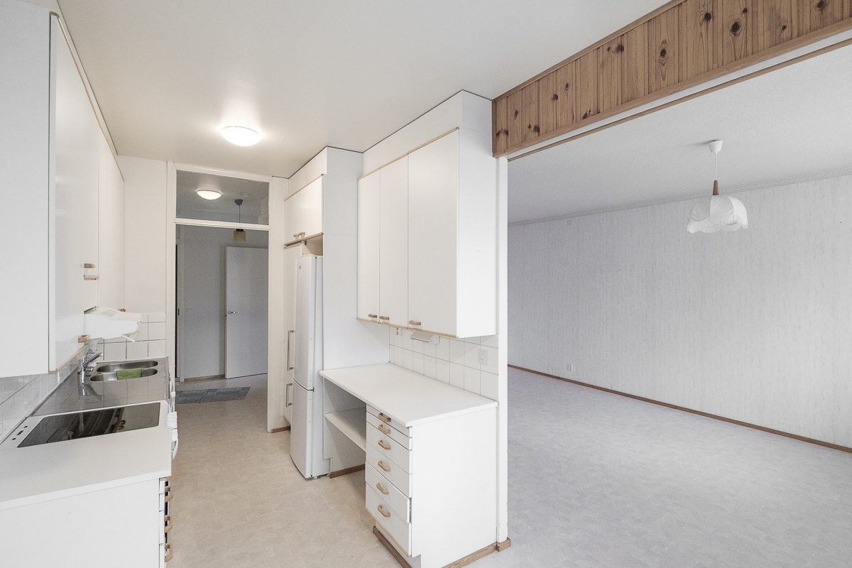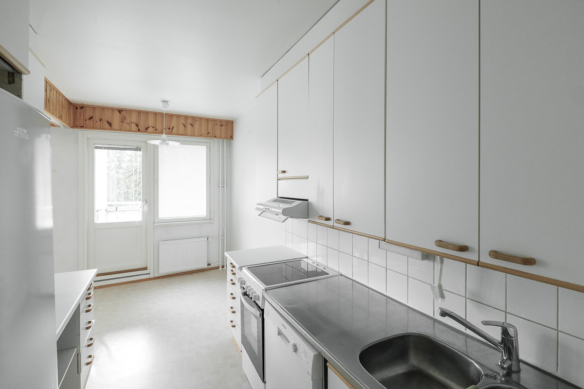 | Keittiön kuvaus | Liesi (Keraaminen liesi), työtasot (laminaatti), seinät (maali), lattiat (muovimatto), jääkaappipakastin, liesi, liesituuletin ja astianpesukone |