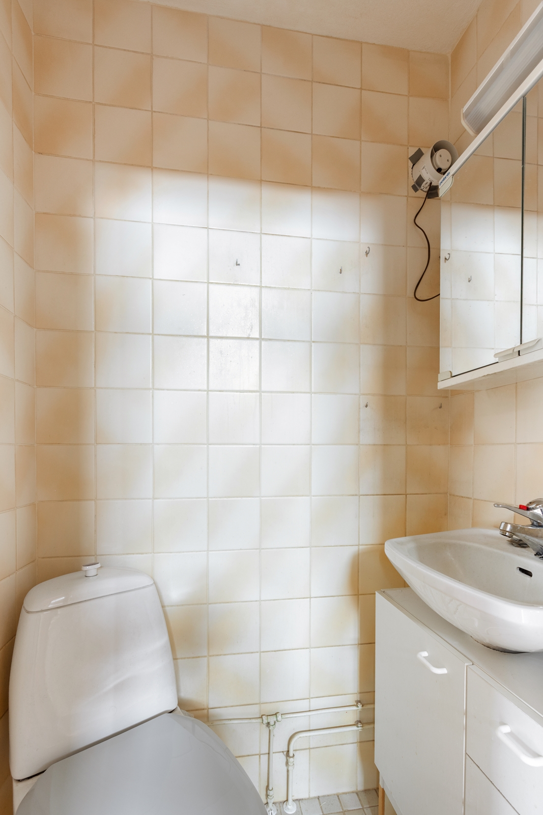 Lukumäärä: 1, WC-istuin, peilikaappi ja allaskaappi, seinät (Kaakeli ja maali), lattiat (Laatta) |