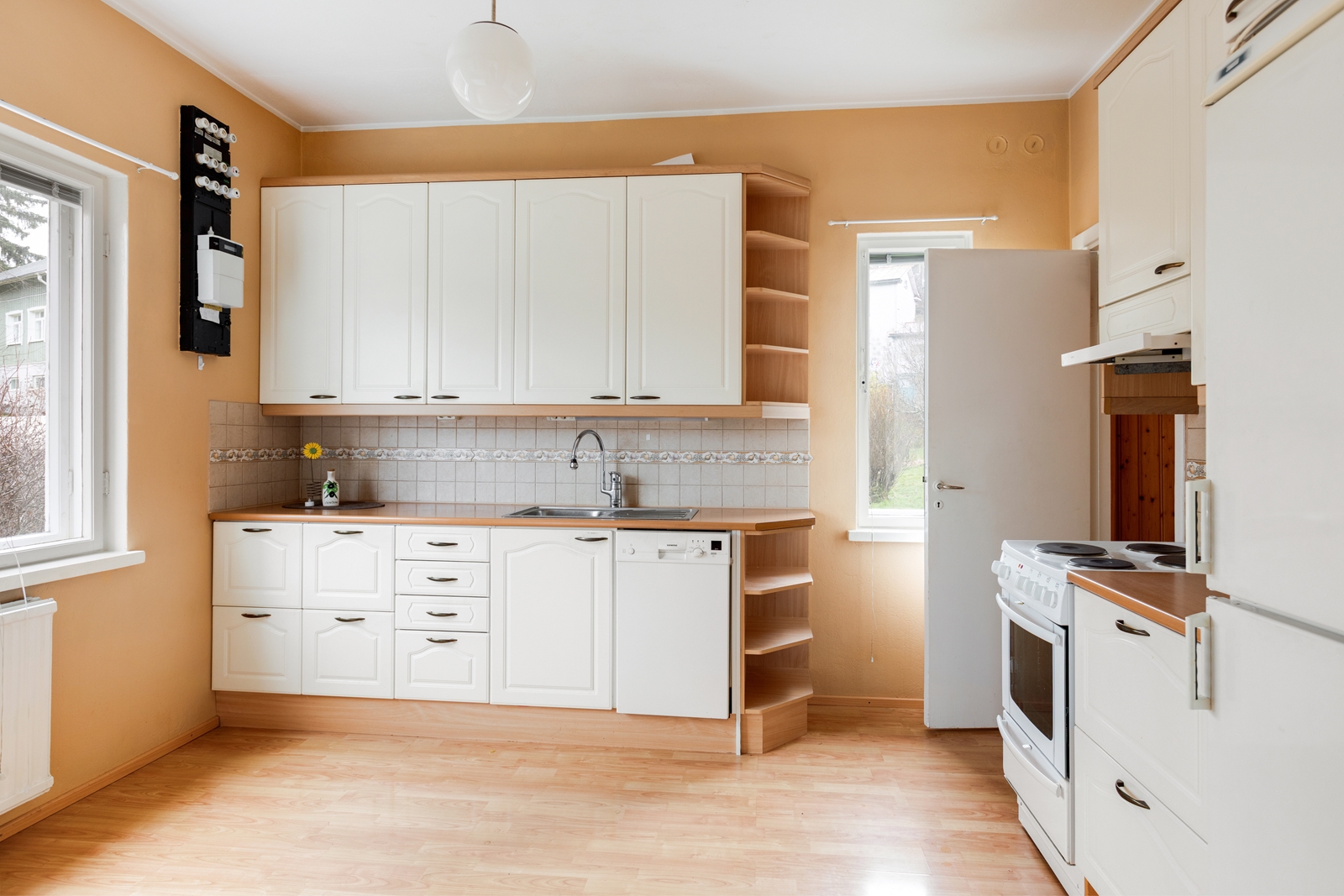 Liesi (sähköliesi), työtasot (laminaatti), seinät (maali ja kaakeli), lattiat (laminaatti), jääkaappipakastin |