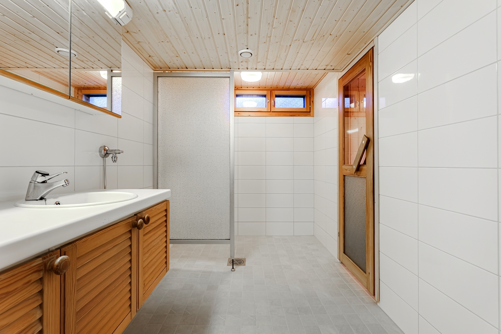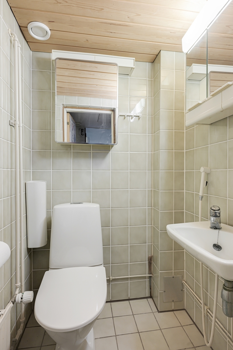 | Kylpyhuoneen kuvaus | Lattialämmitys, peilikaappi, suihku, suihkuseinä ja kiinteät valaisimet, seinät (kaakeli), lattiat (laatta) |