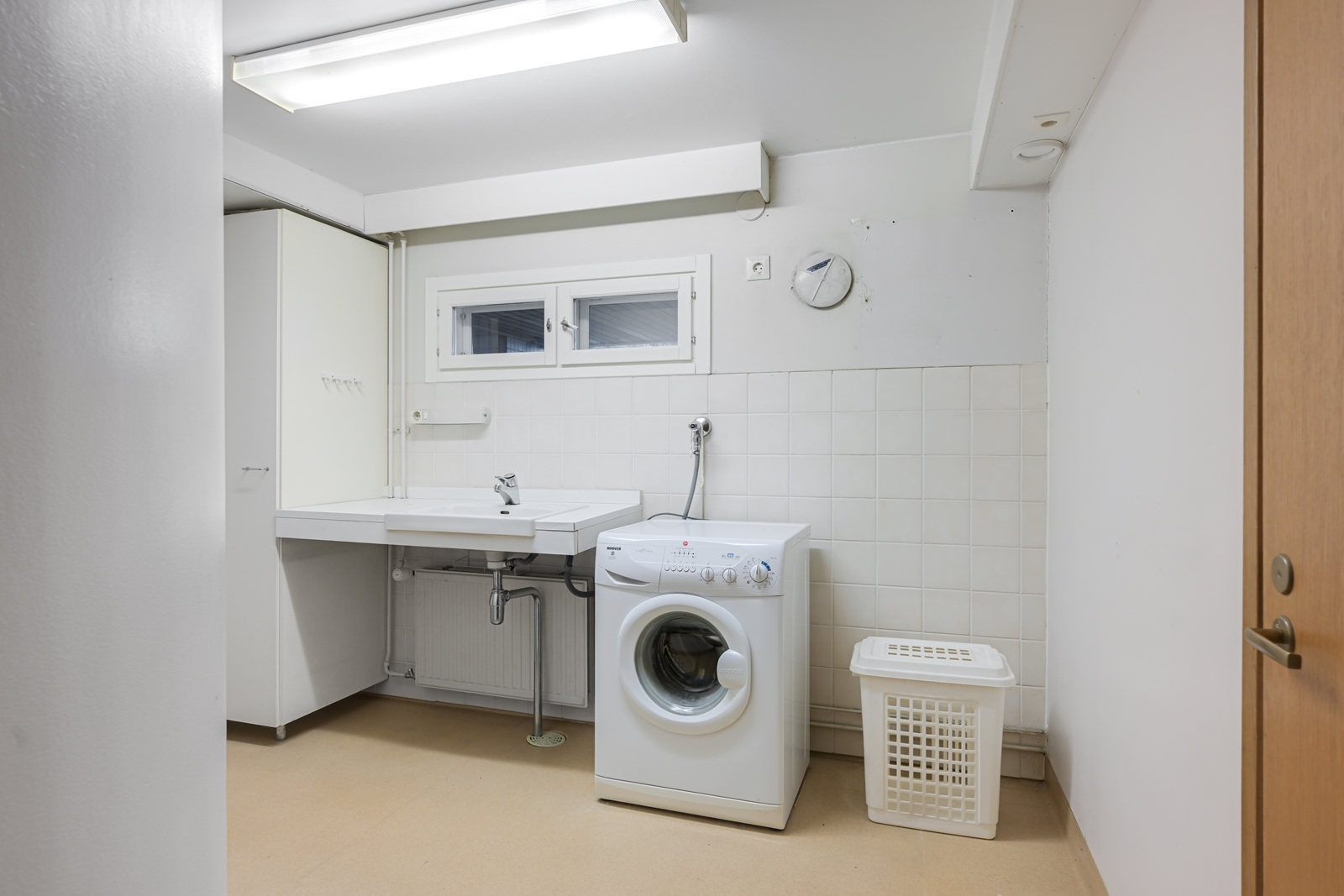 | Kodinhoitohuoneen kuvaus | Lattiakaivo, pesukoneliitäntä, pesukone, pöytätaso, pyykkikaapit ja pesuallas, lattiat (laatta), seinät (maali ja kaakeli) |
