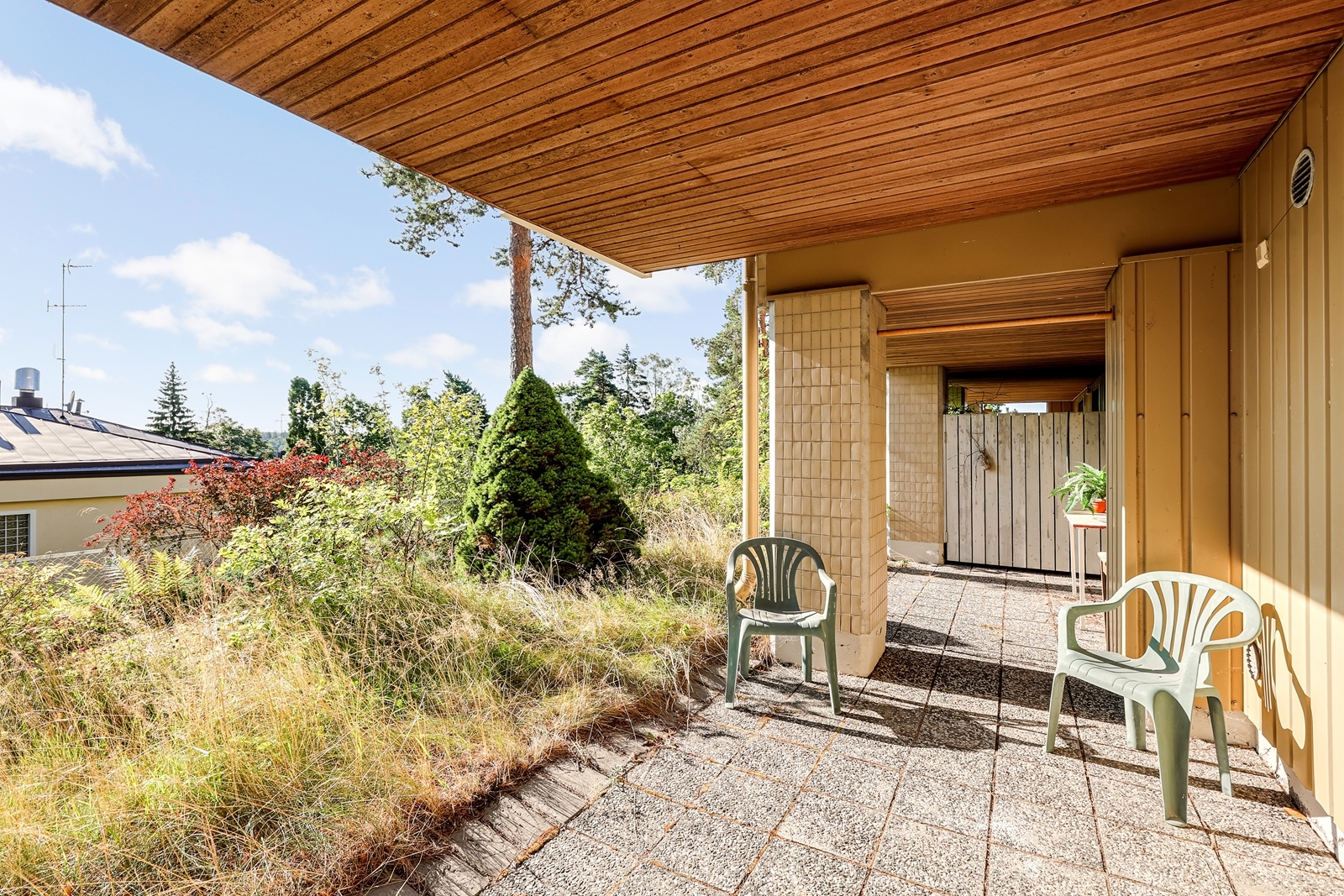 Alakerrassa on takkahuone, josta pääset vilvoittelemaan saunan jälkeen laatoitetulle terassille. Saunaosasto, erillinen wc, kodinhoitohuone ja kaksi vaatehuonetta on myös tässä kerroksessa. Jos tuntuu, että alakerran laatoitettu terassi ei riitä kesäiseen oleskeluun, niin taloyhtiöltä voi vuokrata piha-aluetta omaan käyttöön.