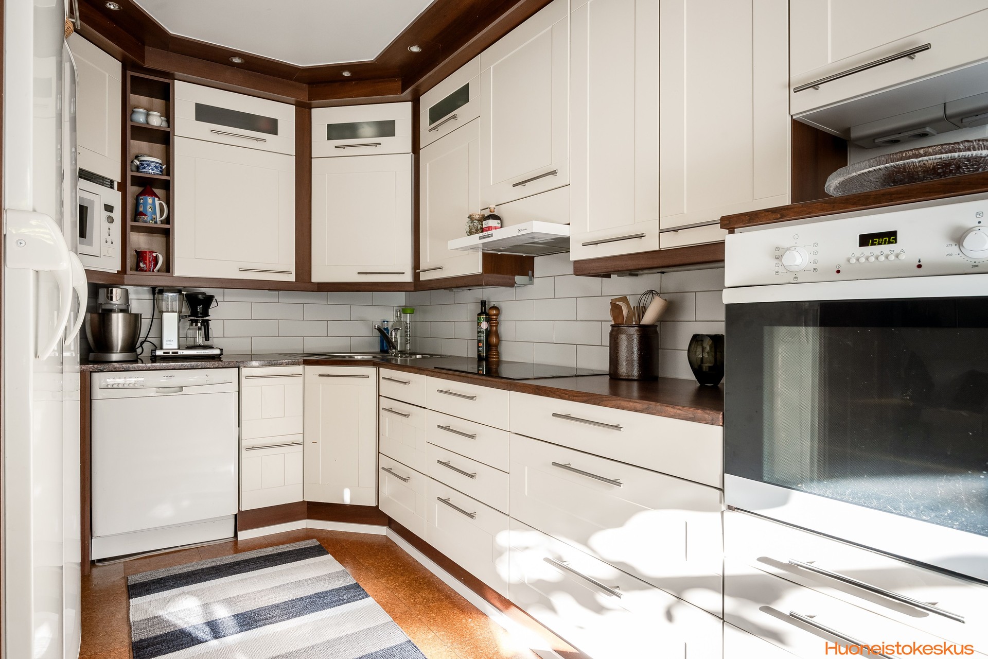 | Keittiön kuvaus | Liesi (Keraaminen liesi), työtasot (laminaatti), lattiat (korkki), jääkaappi, erillinen pakastin, erillisuuni, liesituuletin, mikroaaltouuni ja astianpesukone |