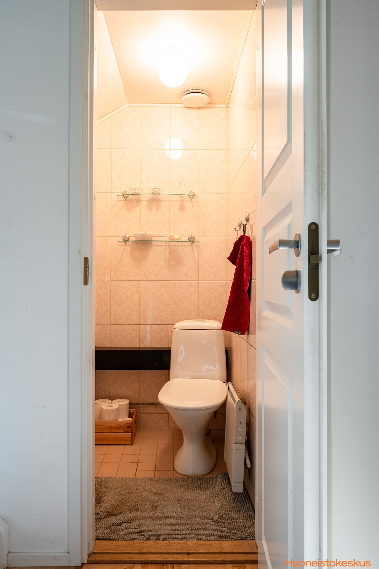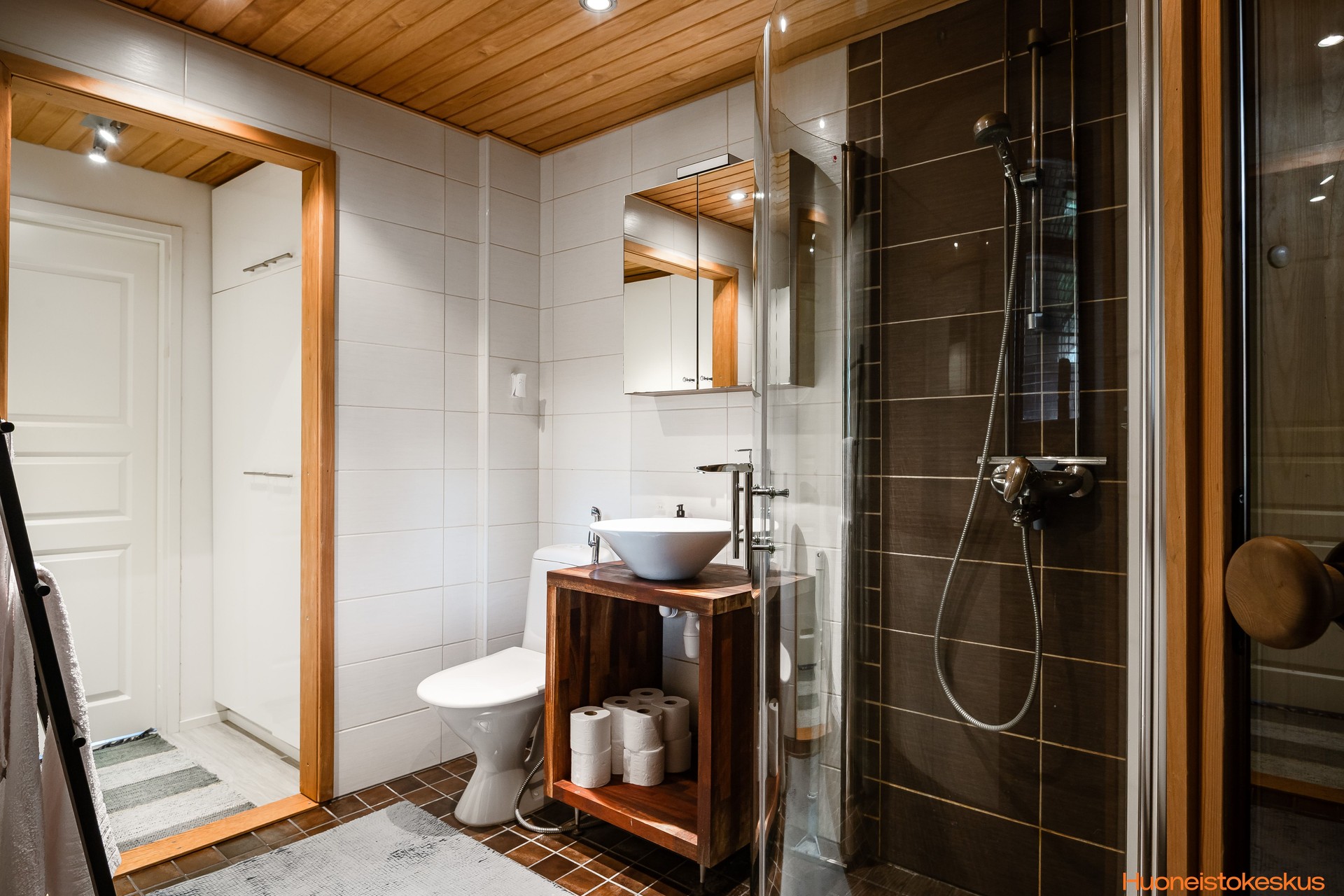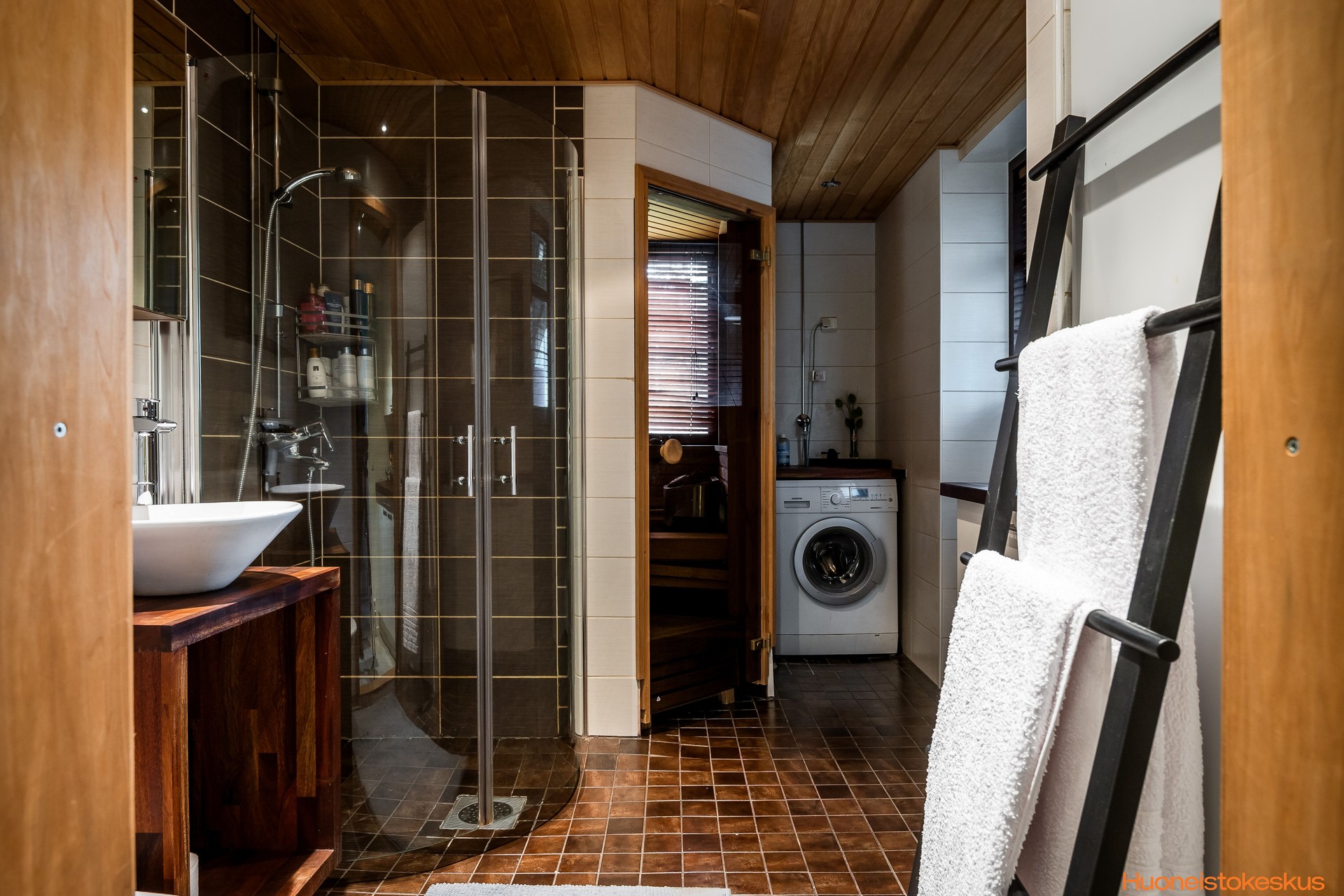 | Kylpyhuoneen kuvaus | WC-istuin, suihku, suihkuseinä, pesukoneliitäntä, lattialämmitys, peilikaappi, pesuallas, allaskaappi ja bidee-suihku, seinät (kaakeli), lattiat (laatta) |