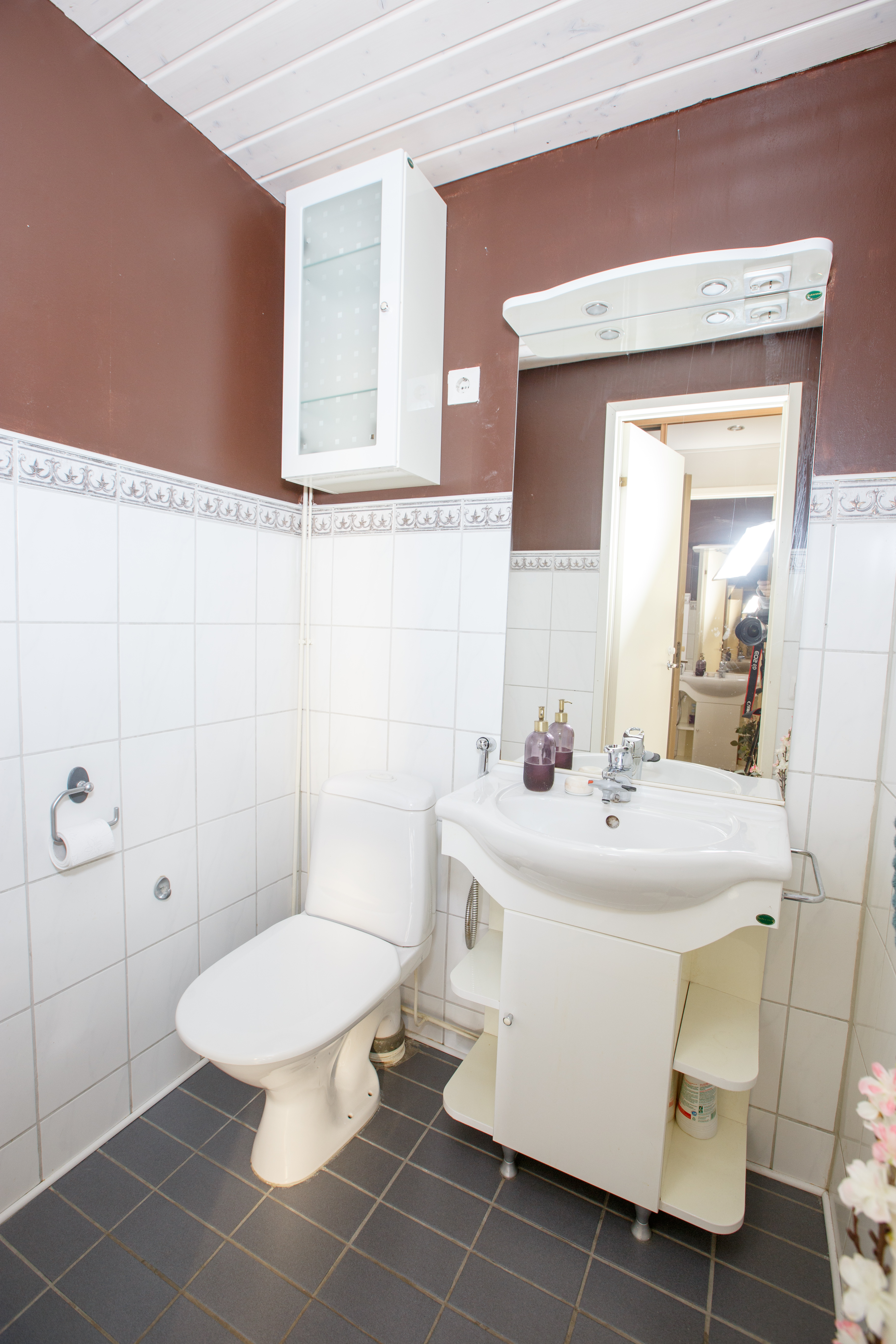 | WC-tilojen kuvaus | Lukumäärä: 1, WC-istuin, bidee-suihku, pesuallas, allaskaappi ja peili, seinät (Kaakeli ja maali), lattiat (Laatta) |