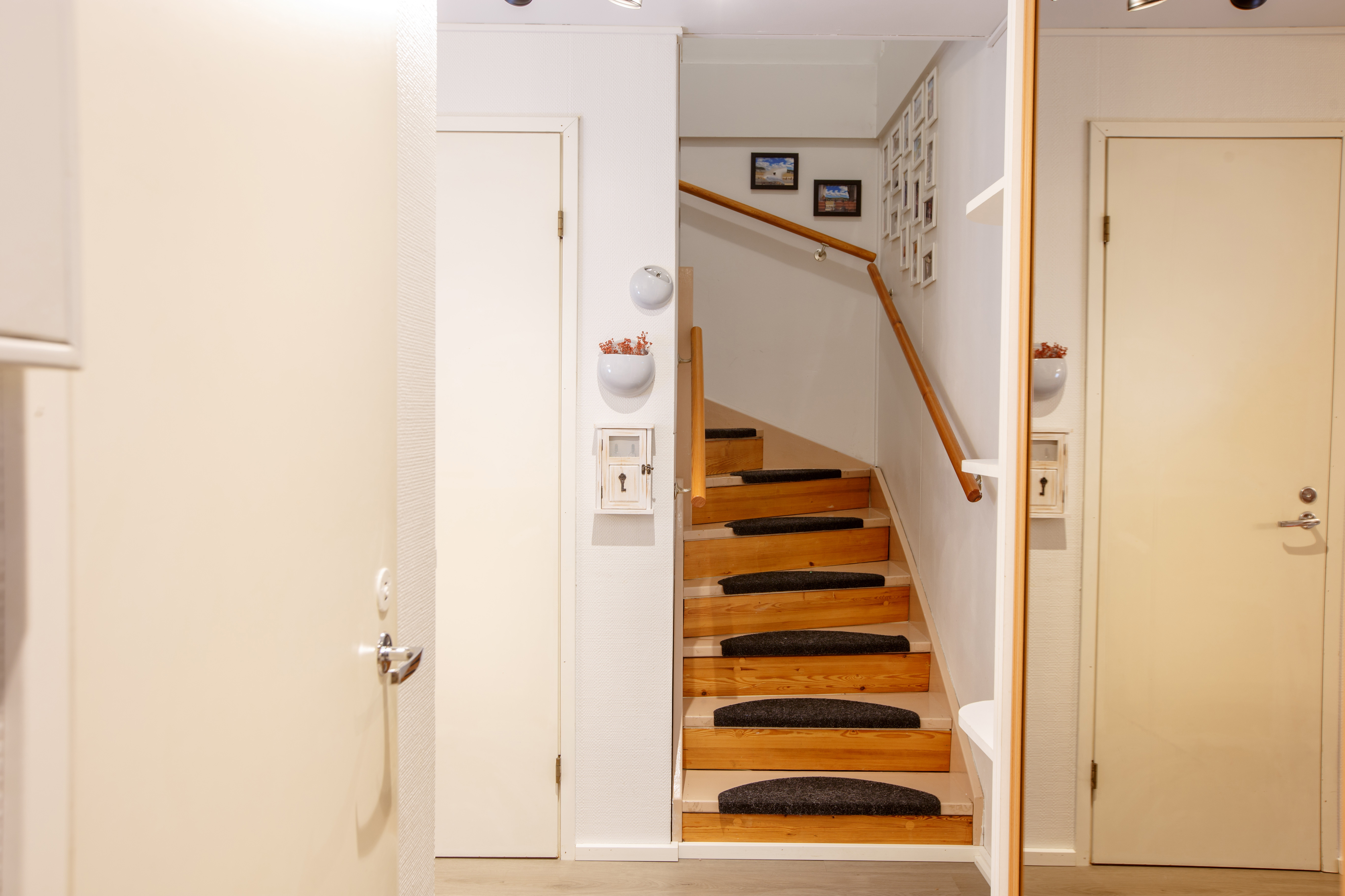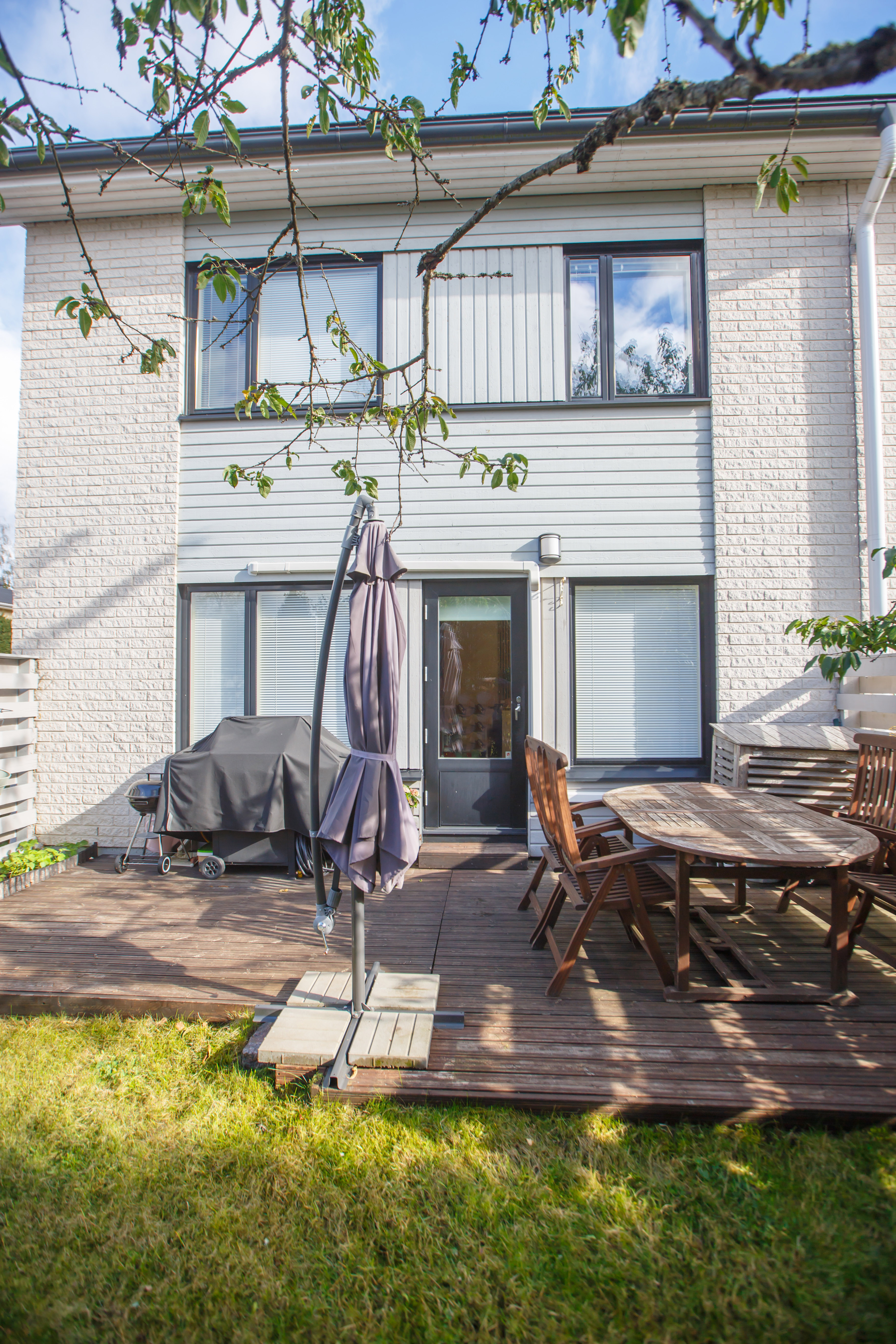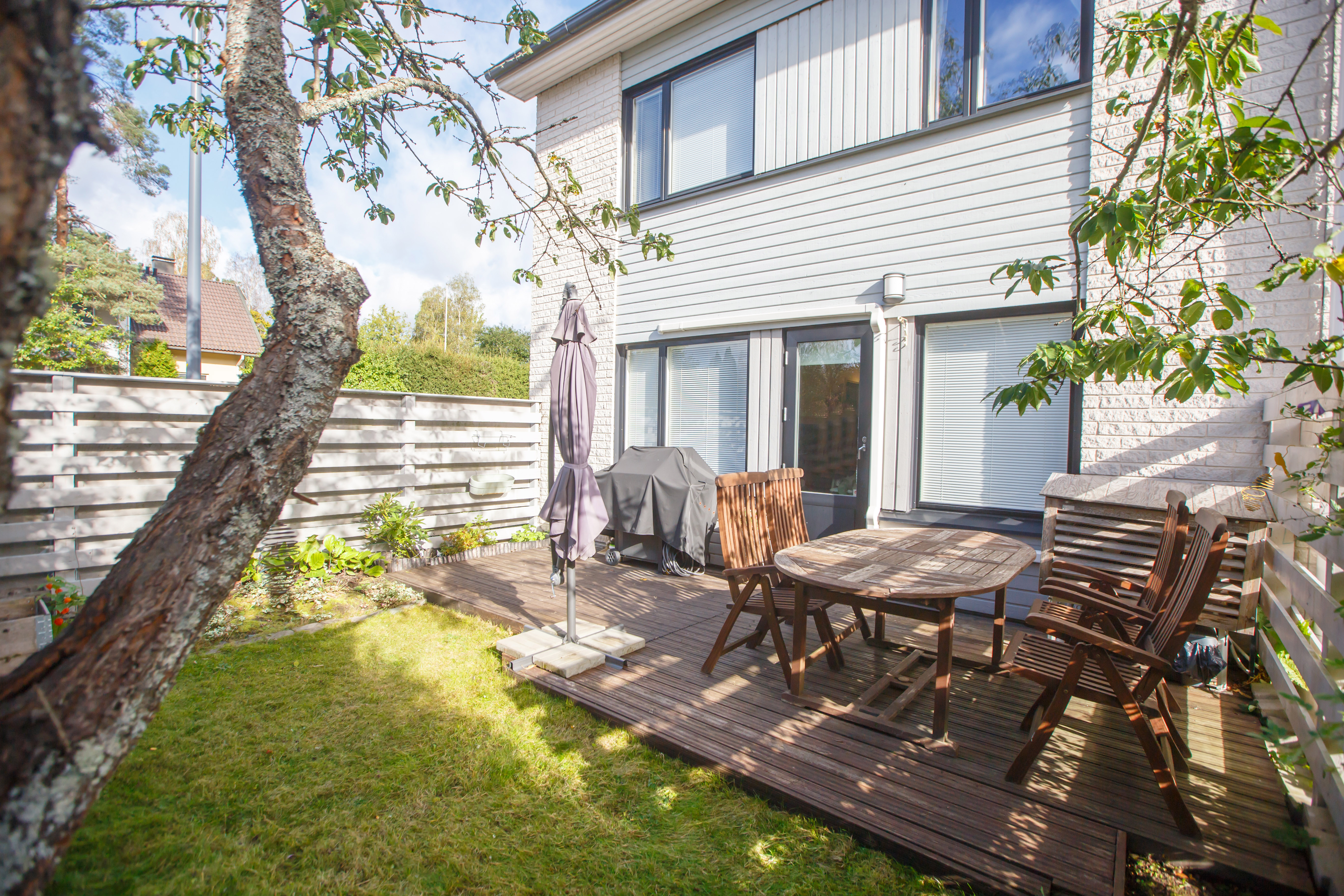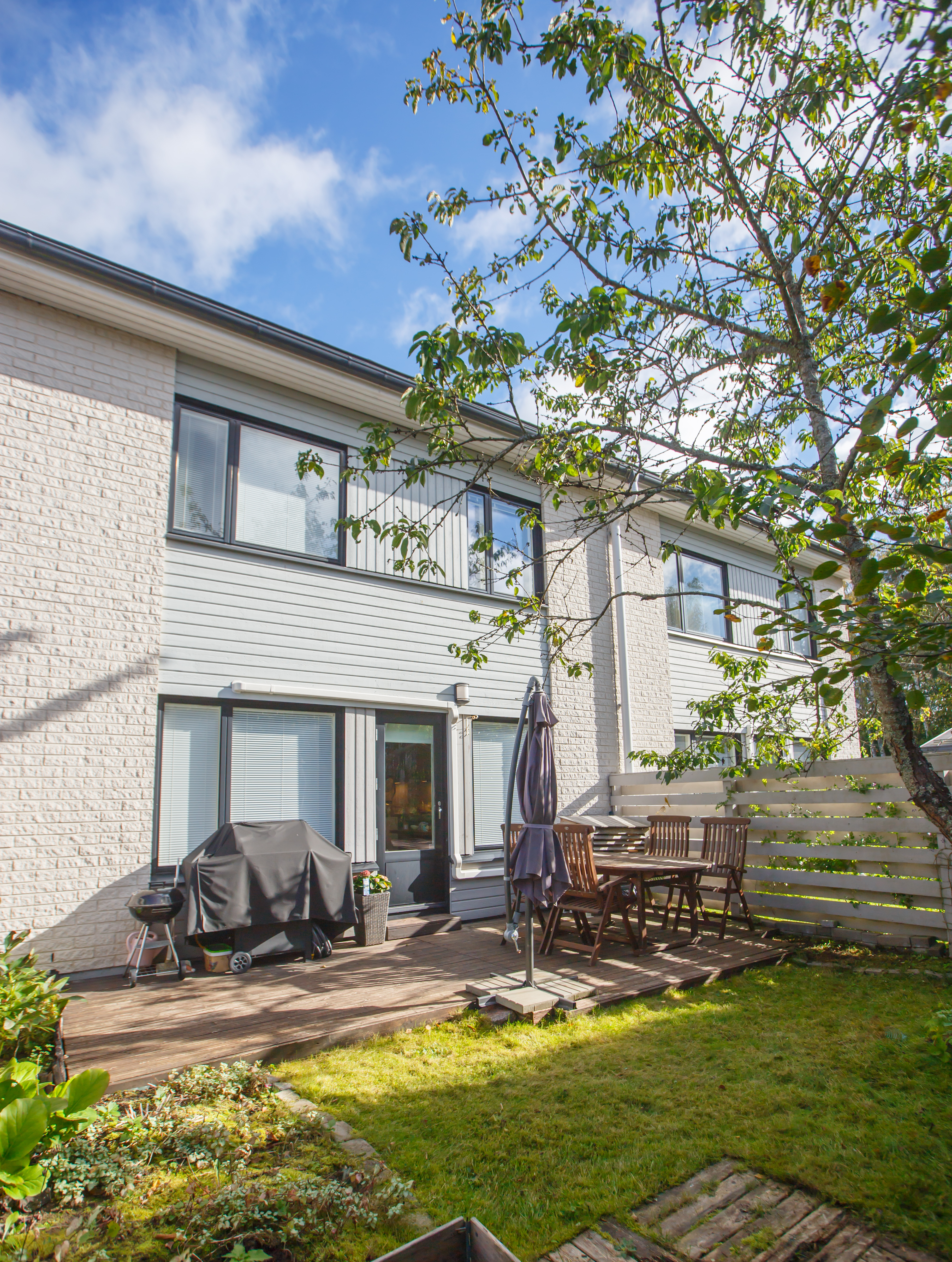 Asunnon vuonna 2024 remontoidusta keittiöstä sekä olohuoneesta aukeaa vehreä maisema takapihan suojaisalle terassille, joka on ilta-auringon suuntaan. Alakerrassa on lisäksi wc, eteisaula vaatekaappeineen ja portaikon alle ulottuva vaatehuone. Asunnon edessä on kylmä varastotila.