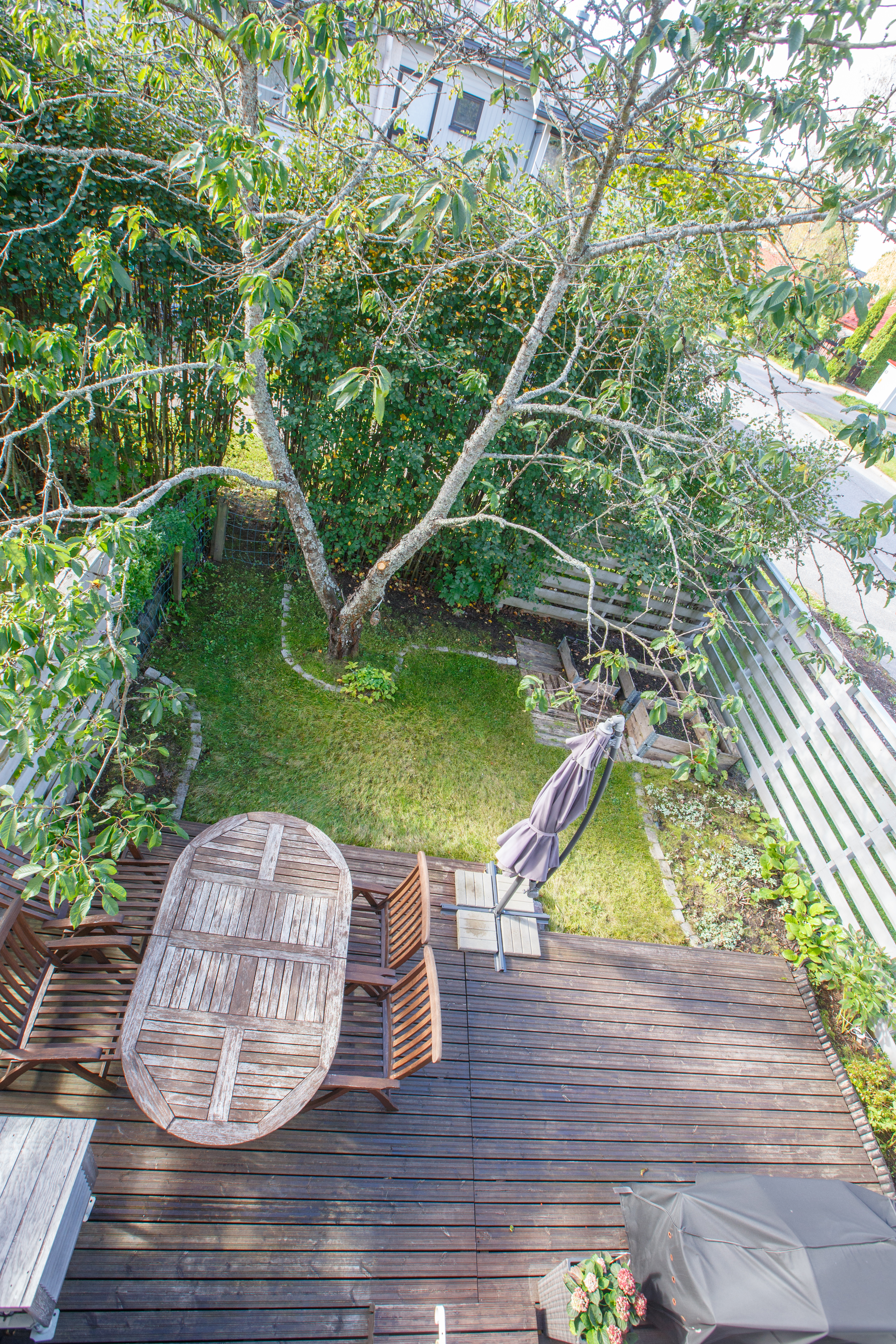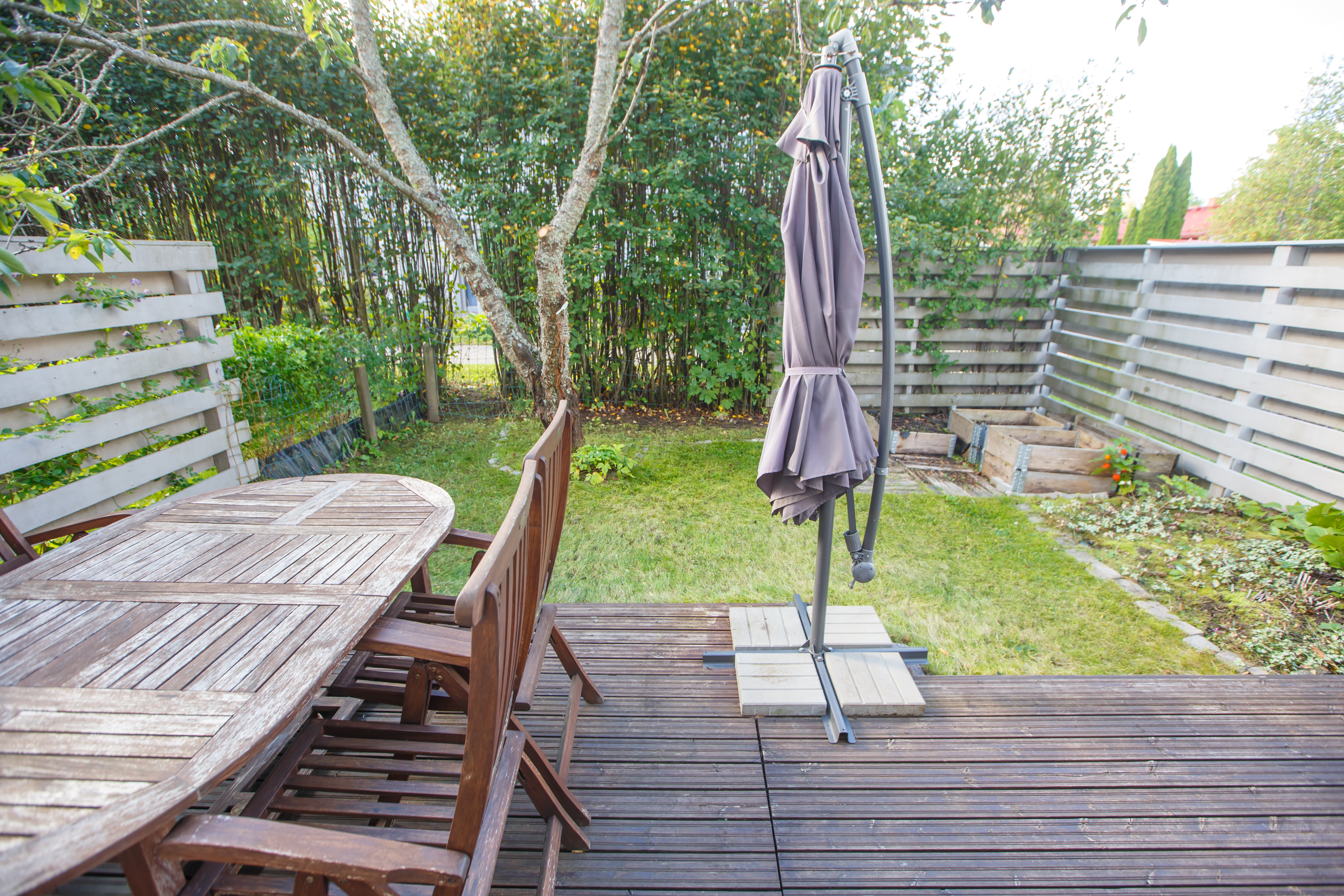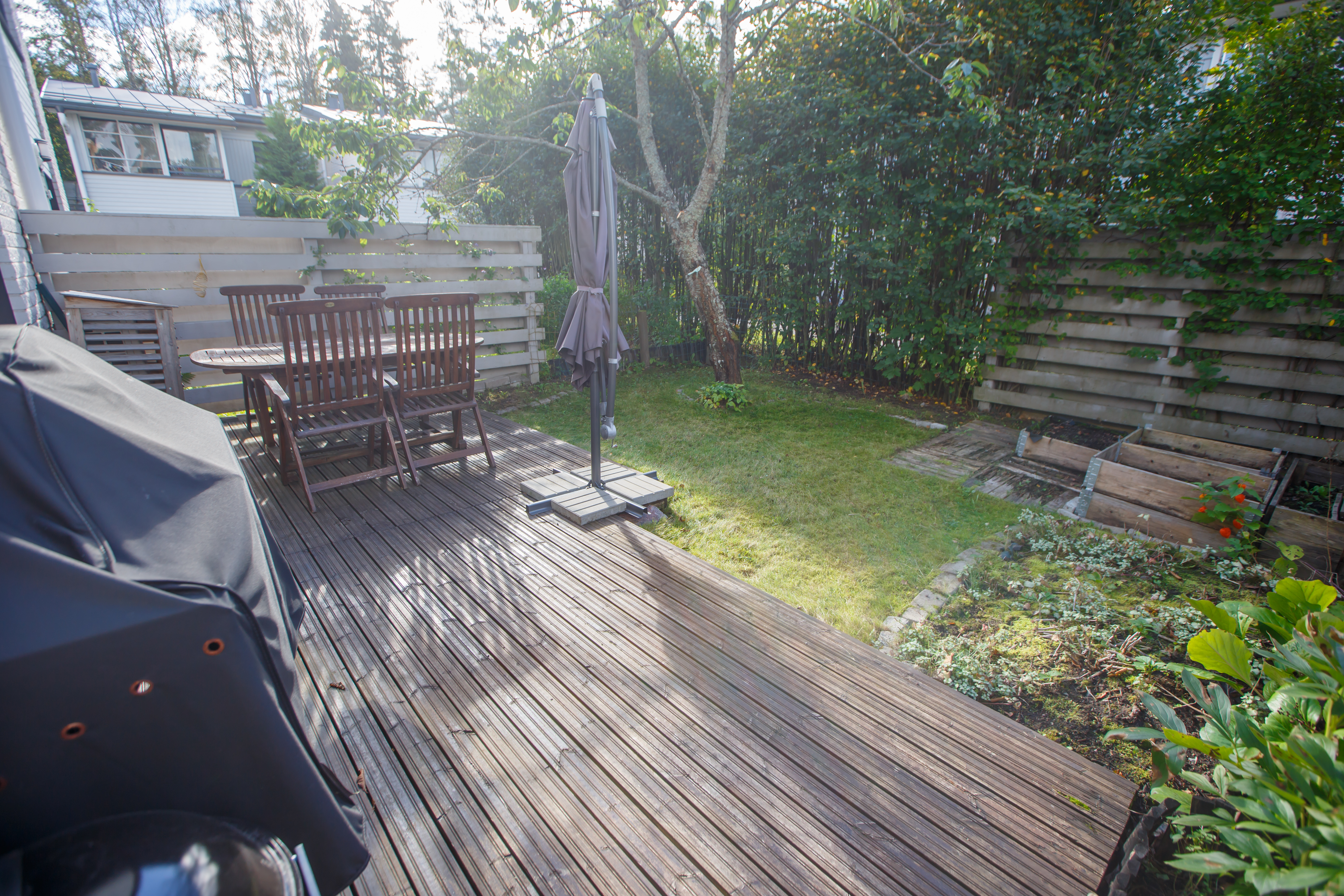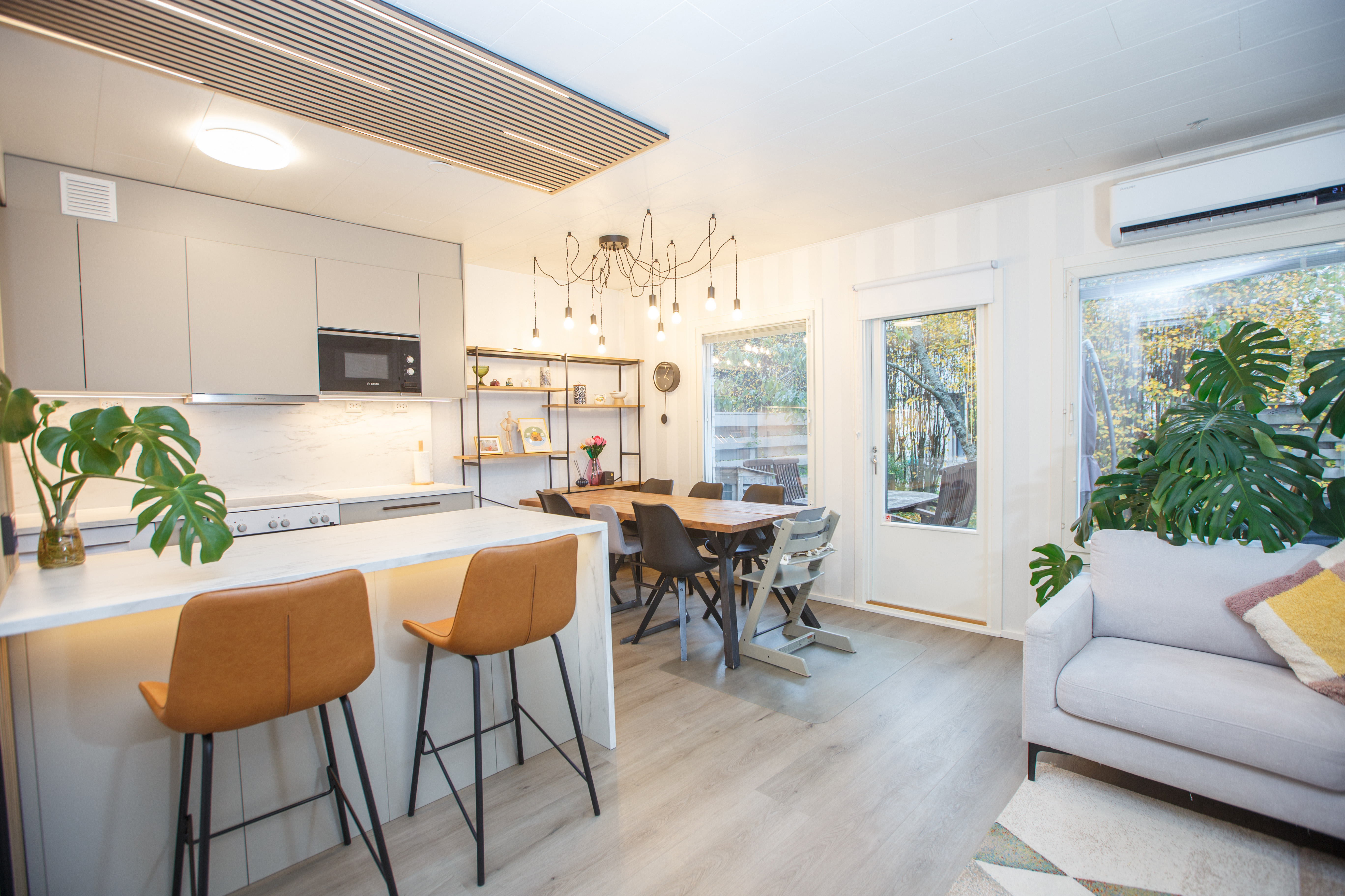 Asunnon vuonna 2024 remontoidusta keittiöstä sekä olohuoneesta aukeaa vehreä maisema takapihan suojaisalle terassille, joka on ilta-auringon suuntaan. Alakerrassa on lisäksi wc, eteisaula vaatekaappeineen ja portaikon alle ulottuva vaatehuone. Asunnon edessä on kylmä varastotila.